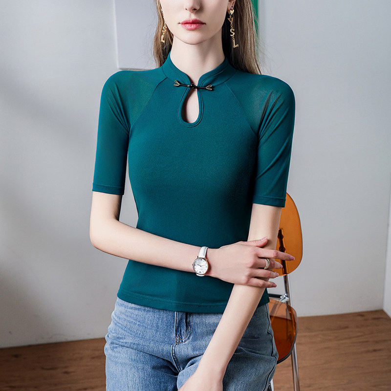 📚 轻国风旗袍领盘扣网纱上衣女五分袖2026秋季新款中袖纯色女装小衫