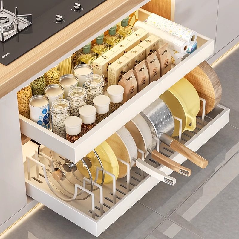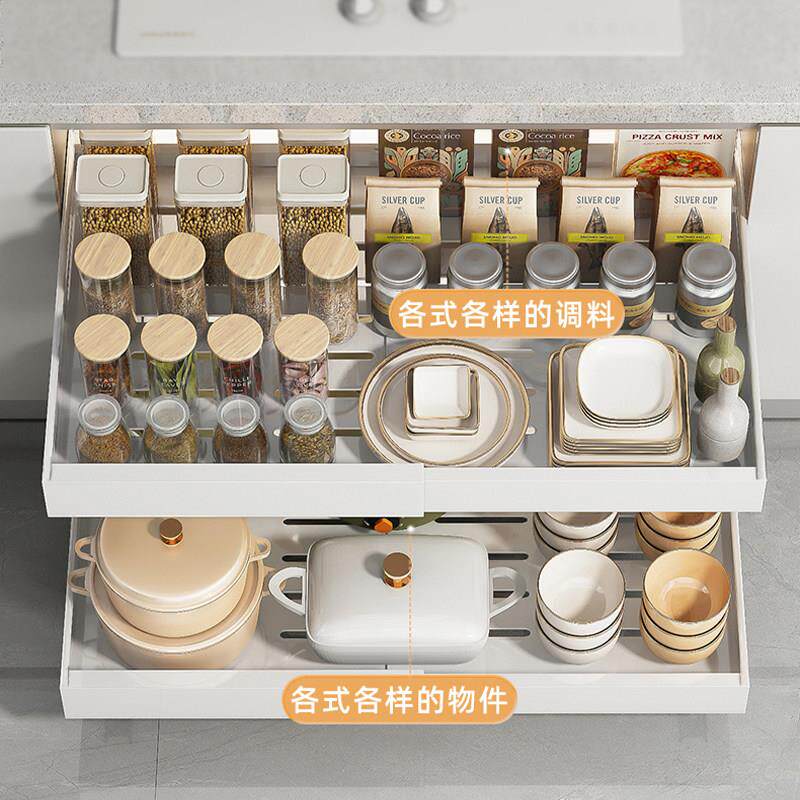 📚 可伸缩收纳层架抽屉式整体橱柜内碗碟架调味瓶放盘子拉篮厨房抽拉