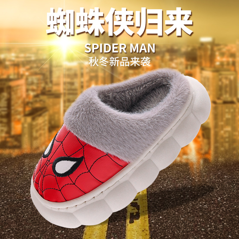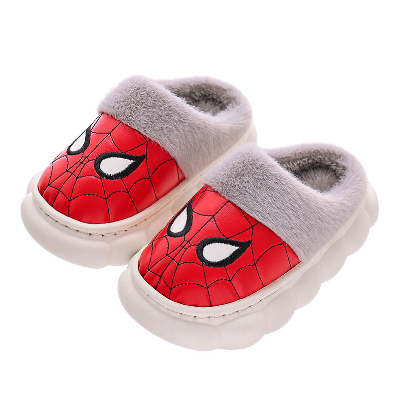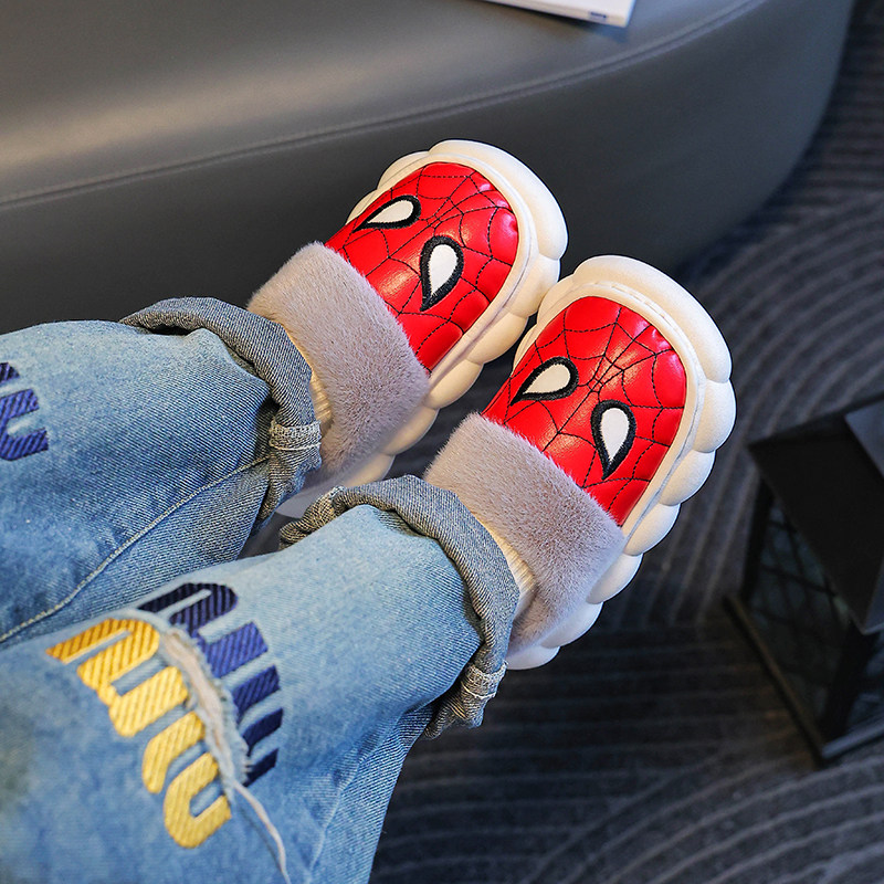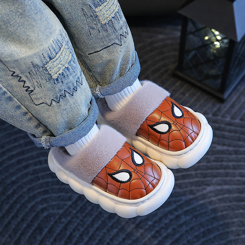 📚 新款 儿童棉拖鞋男童冬季 pu皮面防水男孩宝宝包头毛绒拖鞋冬
