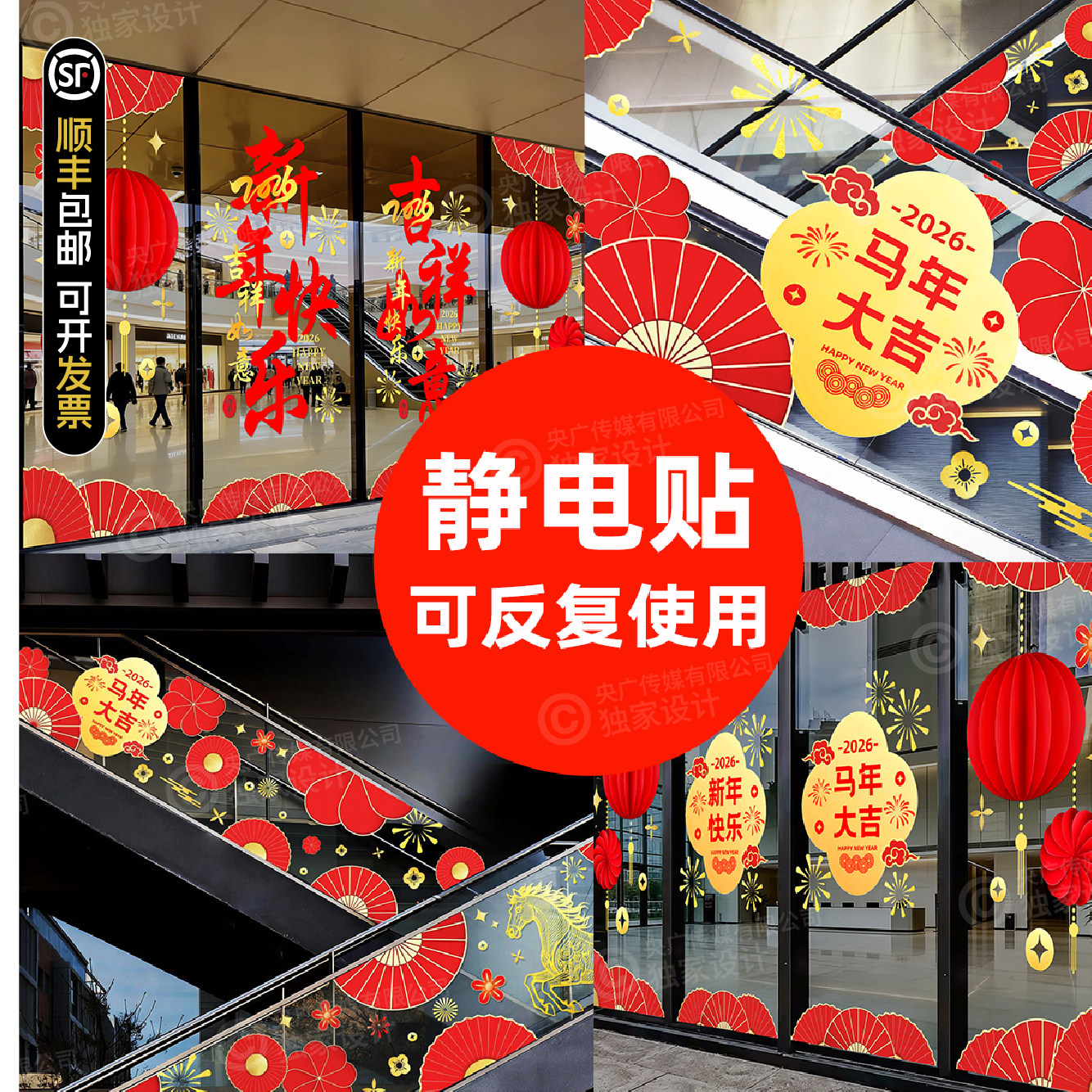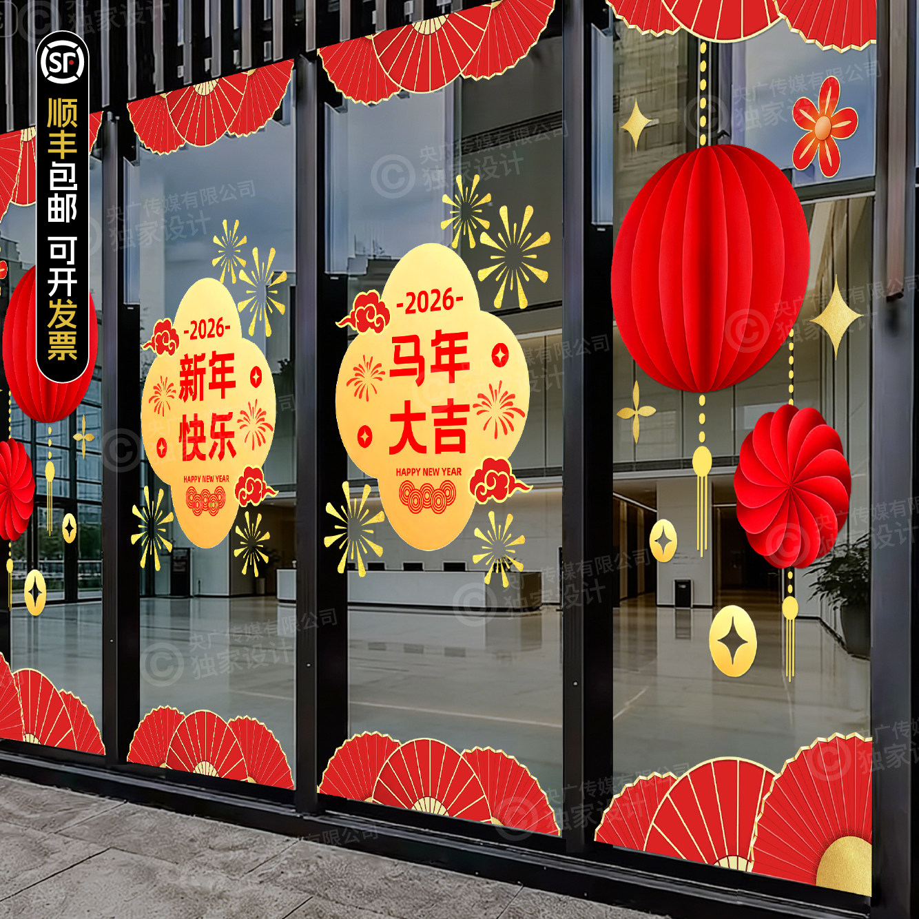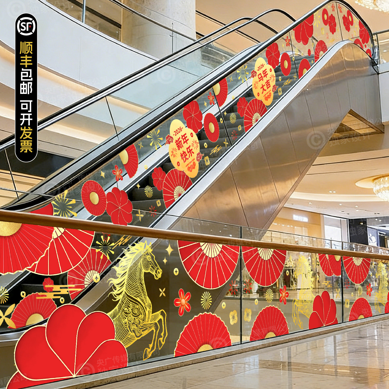 📚 2026新年春节大门玻璃贴纸红色扇子花朵装饰贴膜商场扶梯贴静电贴