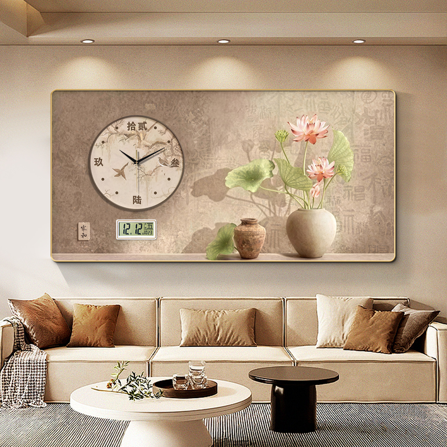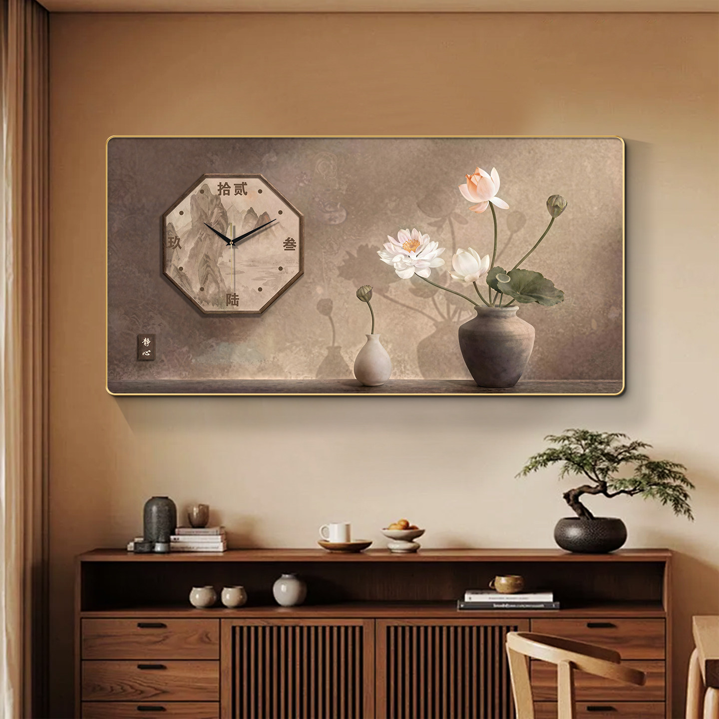 📚 宋代美学餐厅带钟表装饰画新中式客厅新款挂钟壁画高级感时钟挂画