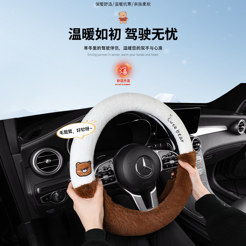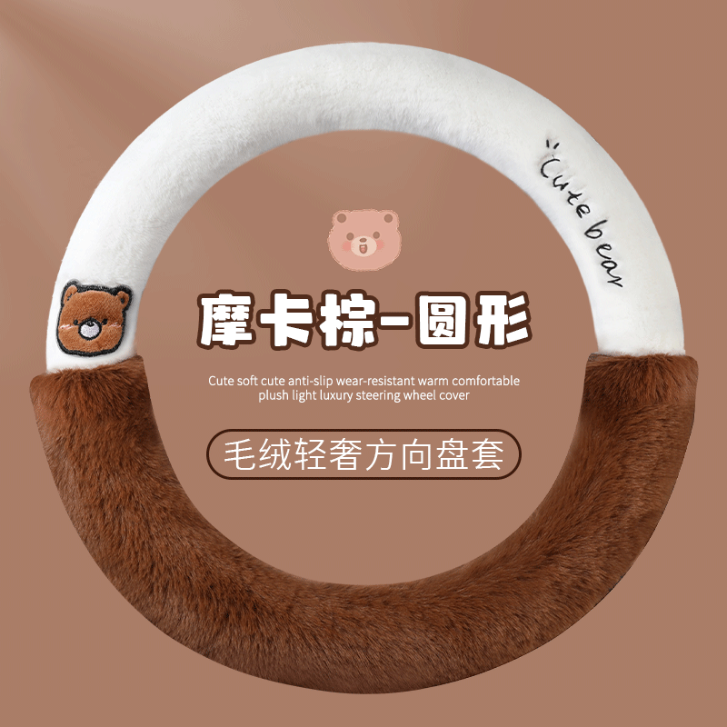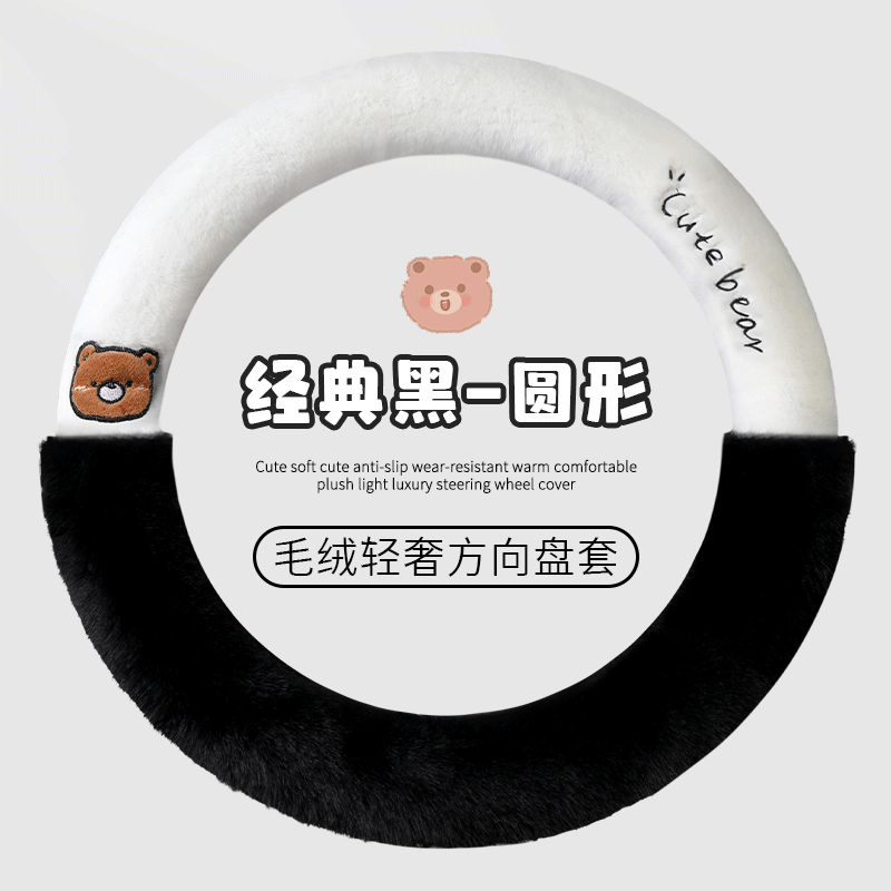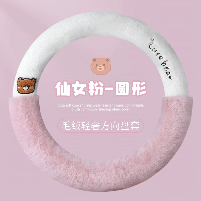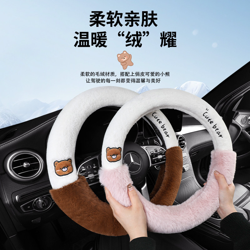 📚 冬季卡通朗朗熊毛绒款方向盘套亲肤柔软保暖防滑厚款通用汽车把套