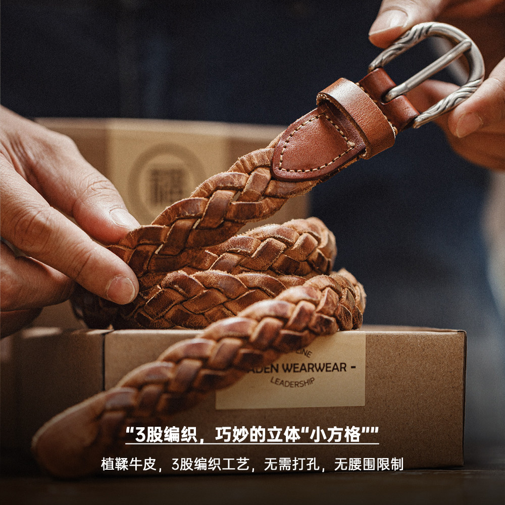 📚 马登复古编织植鞣牛皮真皮腰带阿美咔叽配饰带头针扣皮带男女