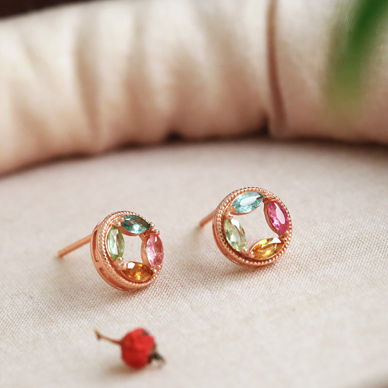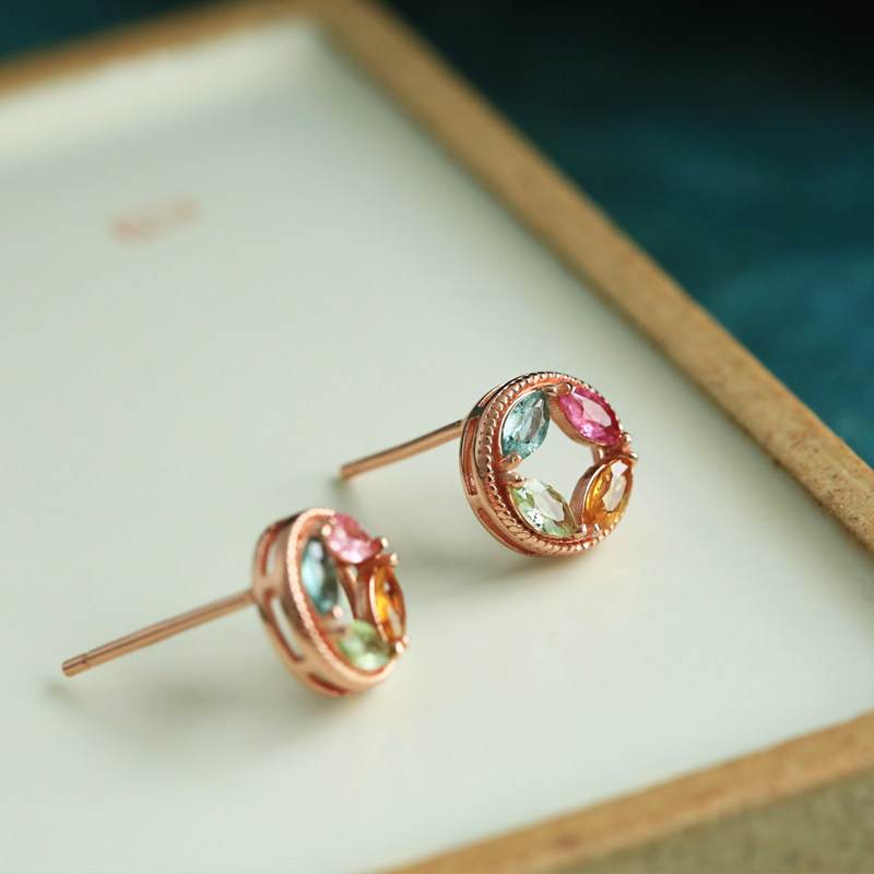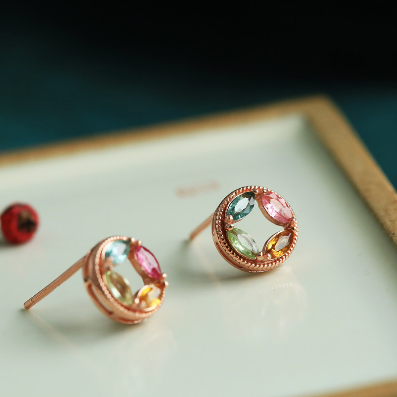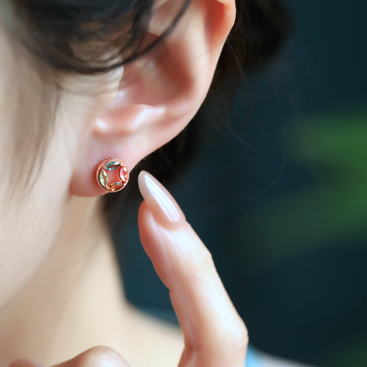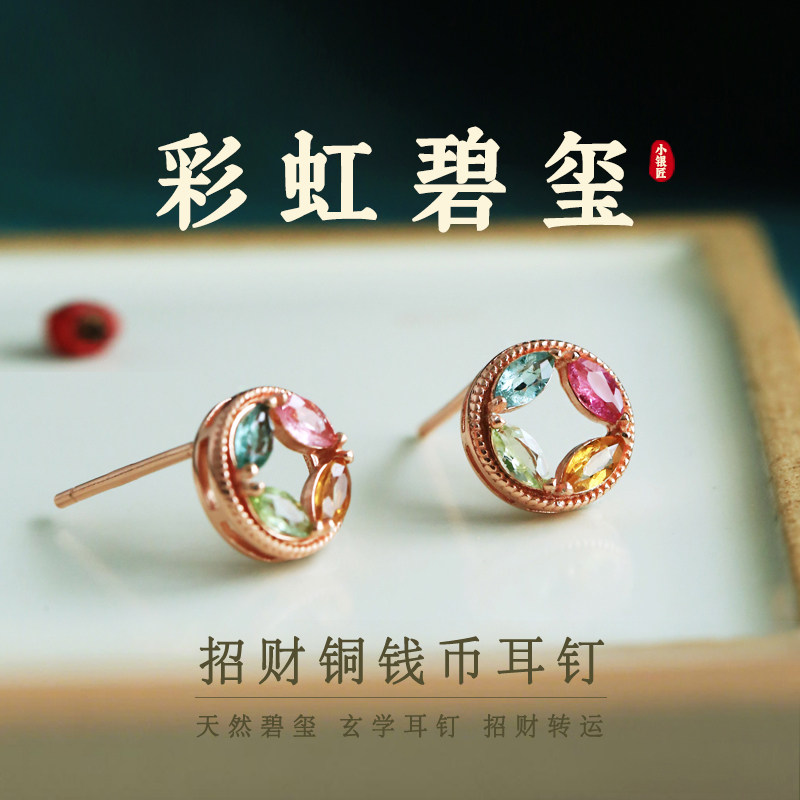📚 天然碧玺纯银铜钱小耳钉女新中式旺财多巴胺彩色宝石水晶耳饰耳环
