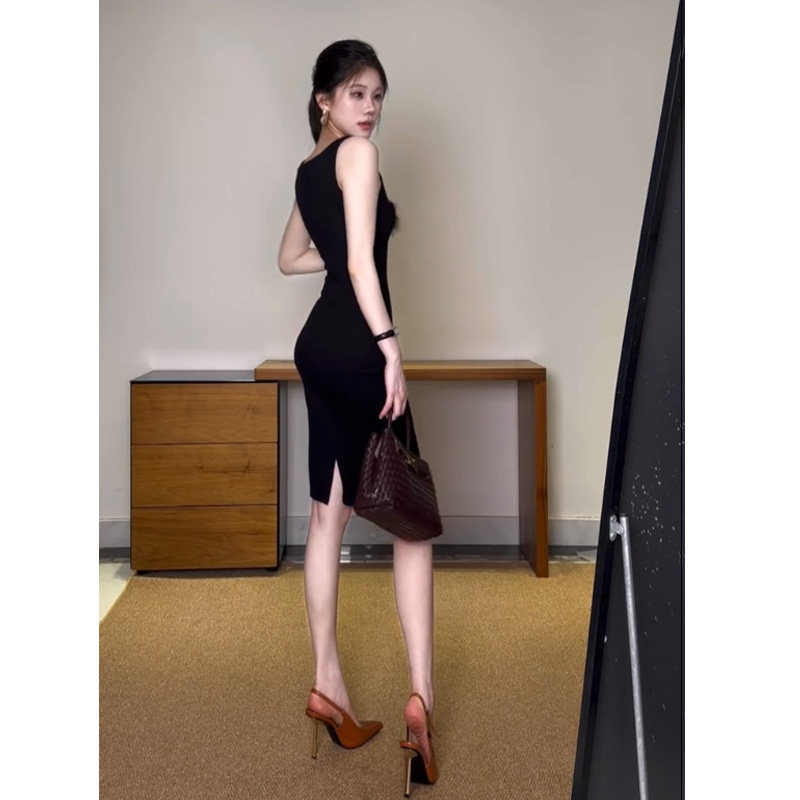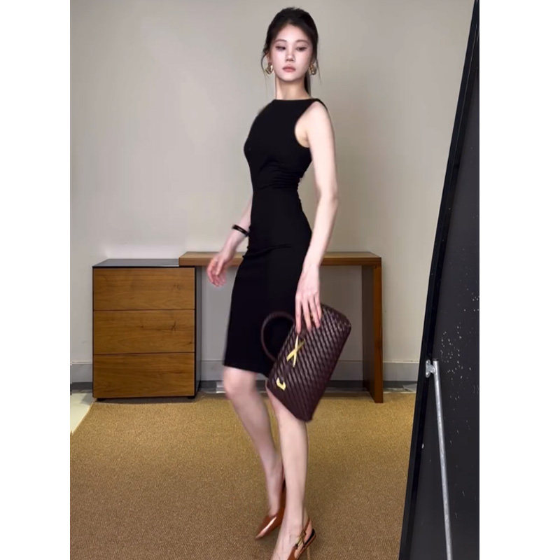 📚 一字领掐腰包臀连衣裙女高智知识分子风简约大气修身性感开叉裙