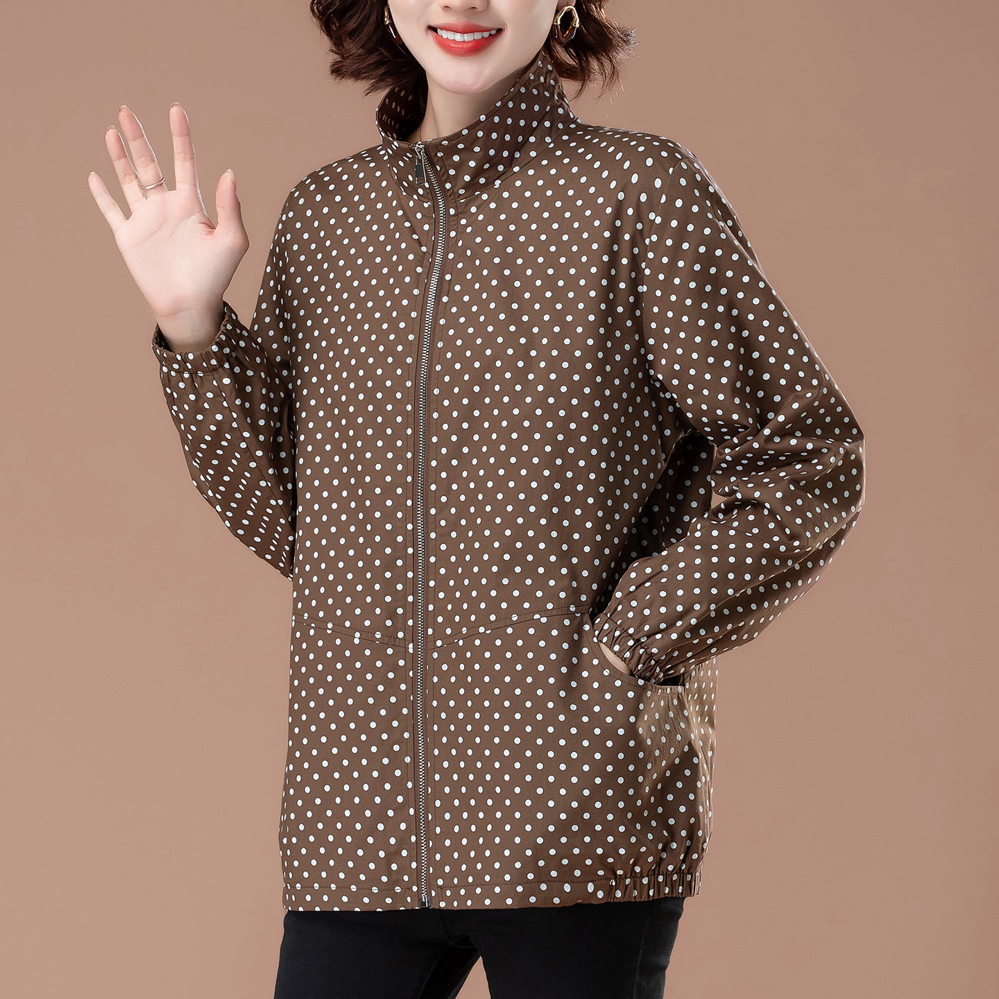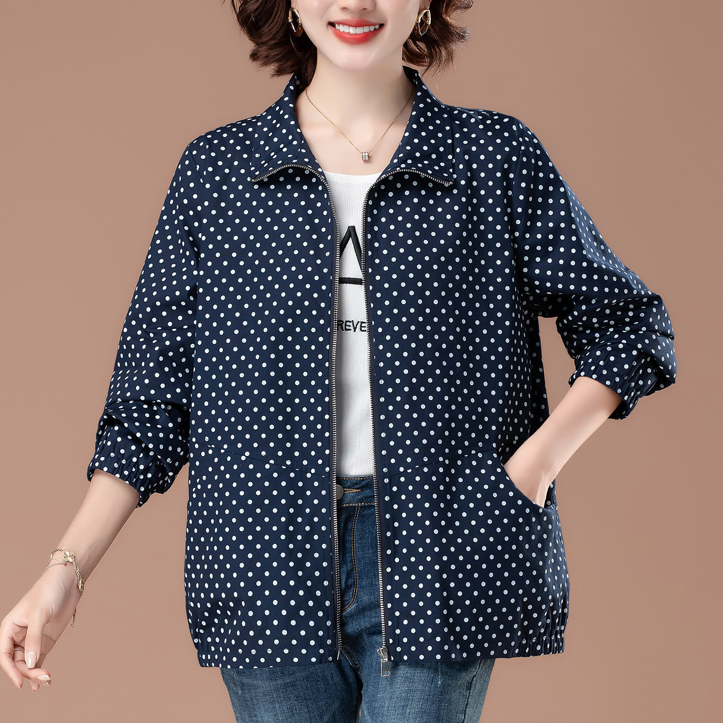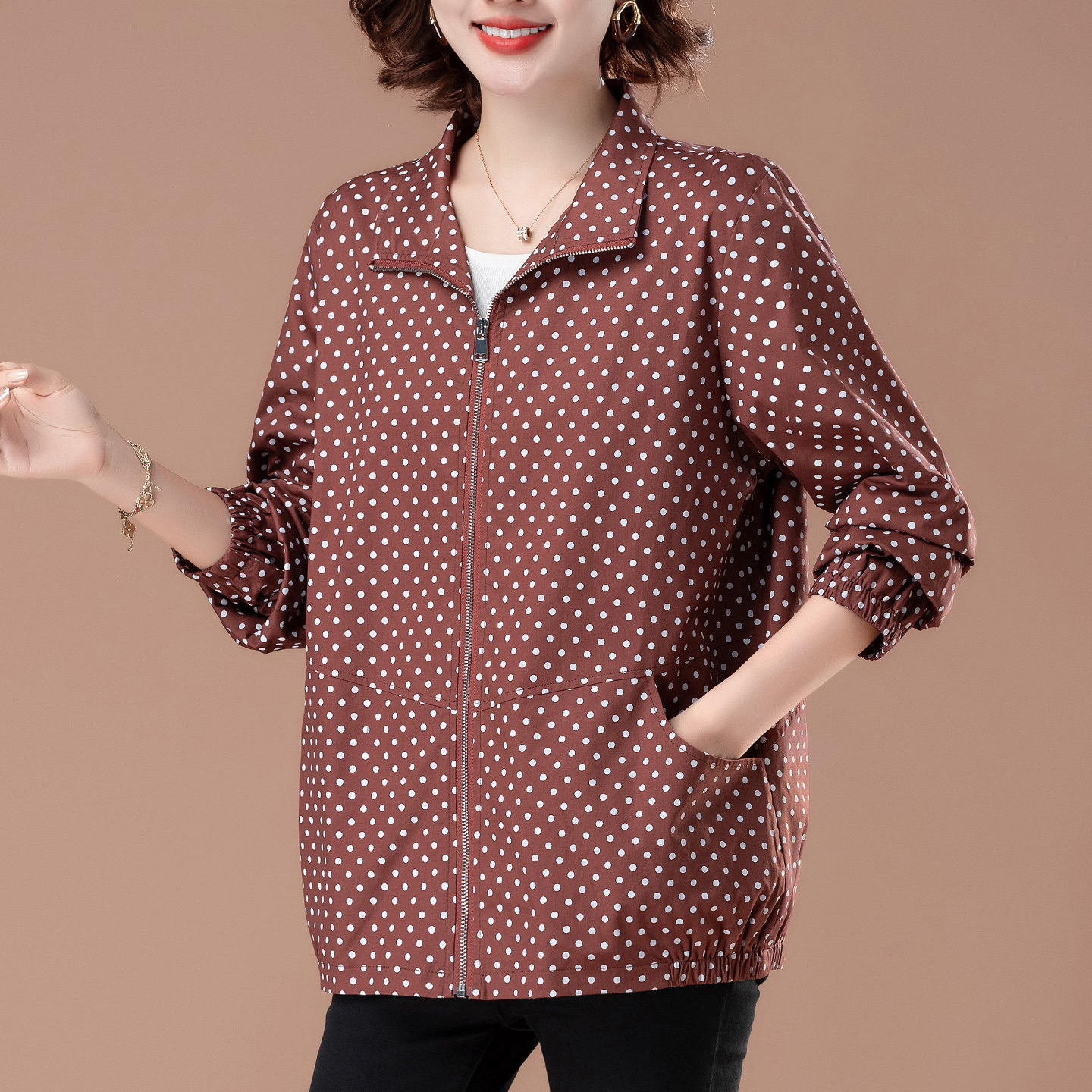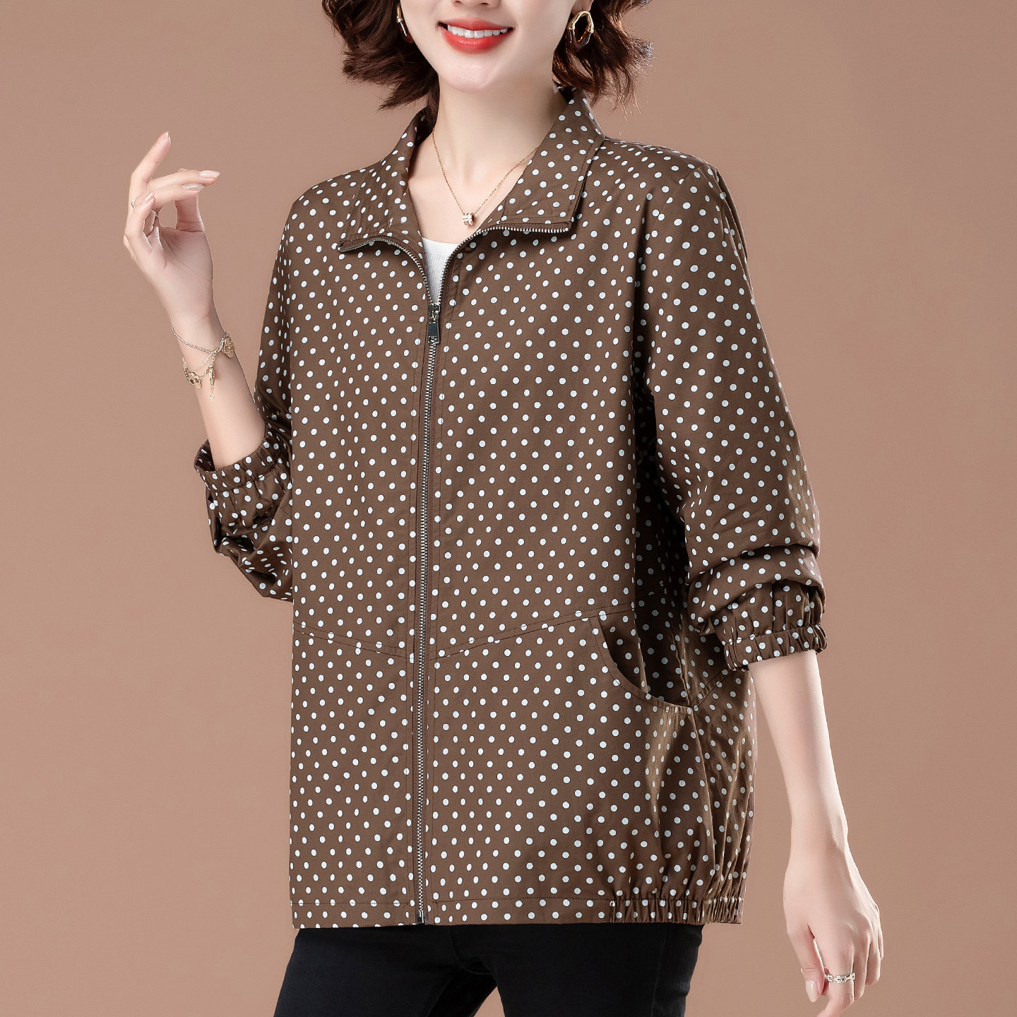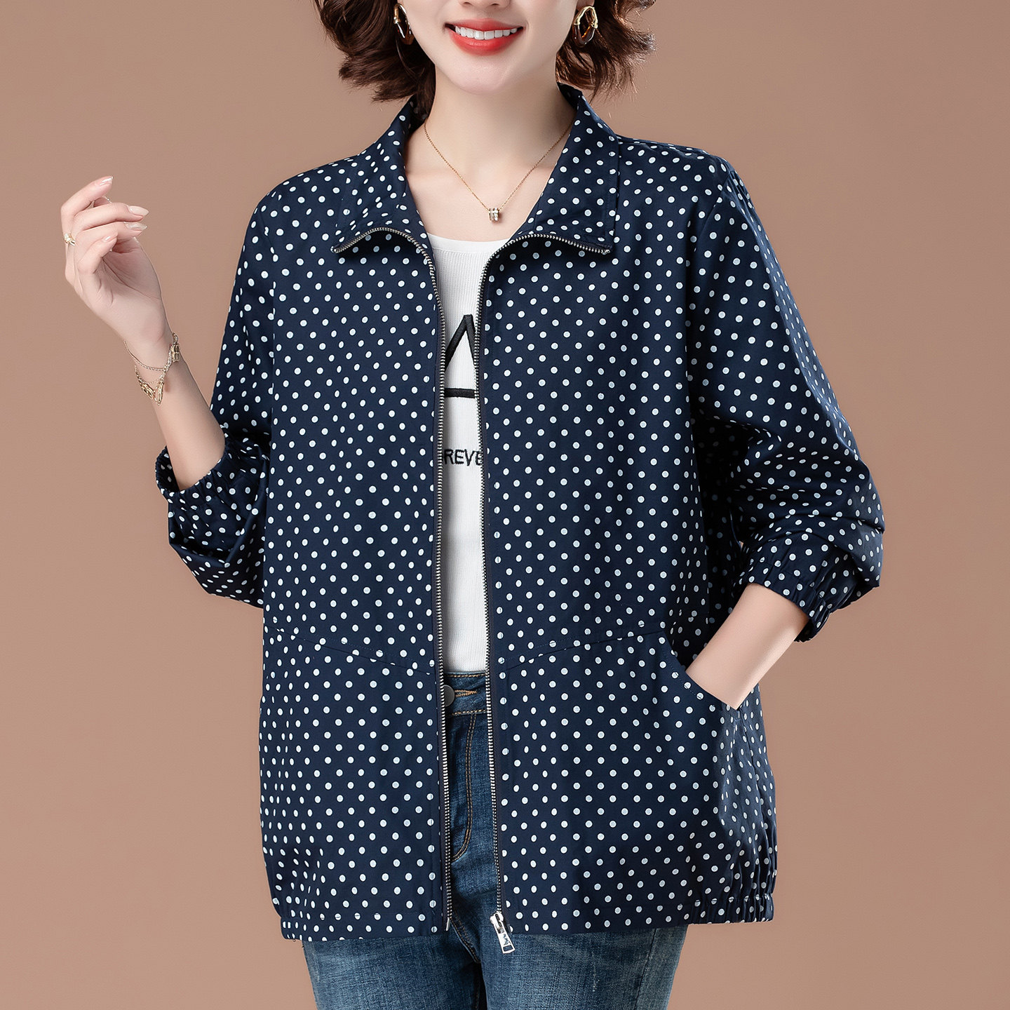 📚 中年妈妈波点外套女春秋薄款大码老人风衣50多岁夹克贵妇宽松上衣