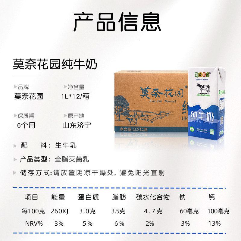 📚 莫奈花园纯牛奶全脂牛奶1L*12盒整箱咖啡奶泡烘焙茶饮酸奶商用