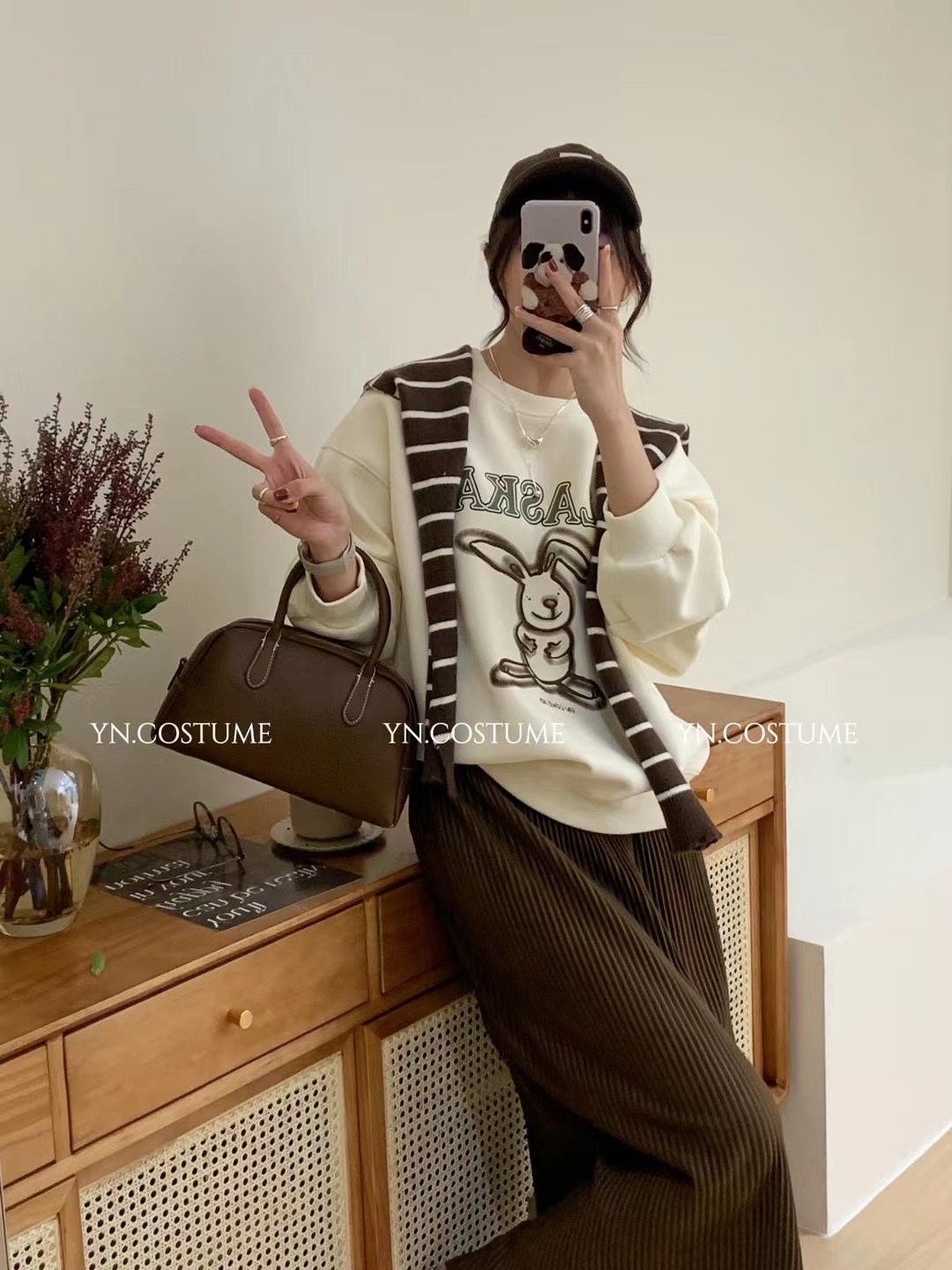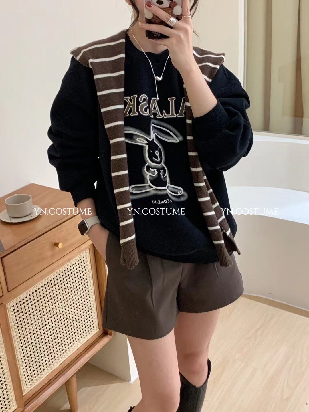 📚 YN新品韩版宽松慵懒风披肩两件套圆领卫衣女2023秋冬小熊套头上衣
