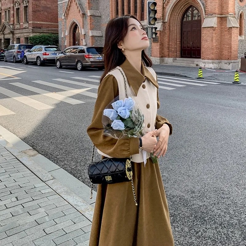 📚 今年流行连衣裙套装女冬季新款美拉德穿搭马甲两件套遮肉显瘦裙子