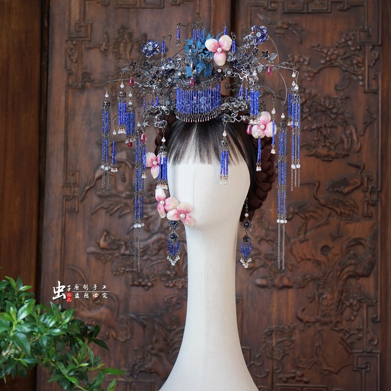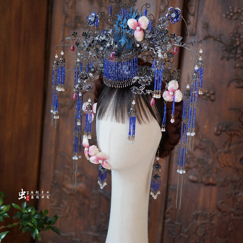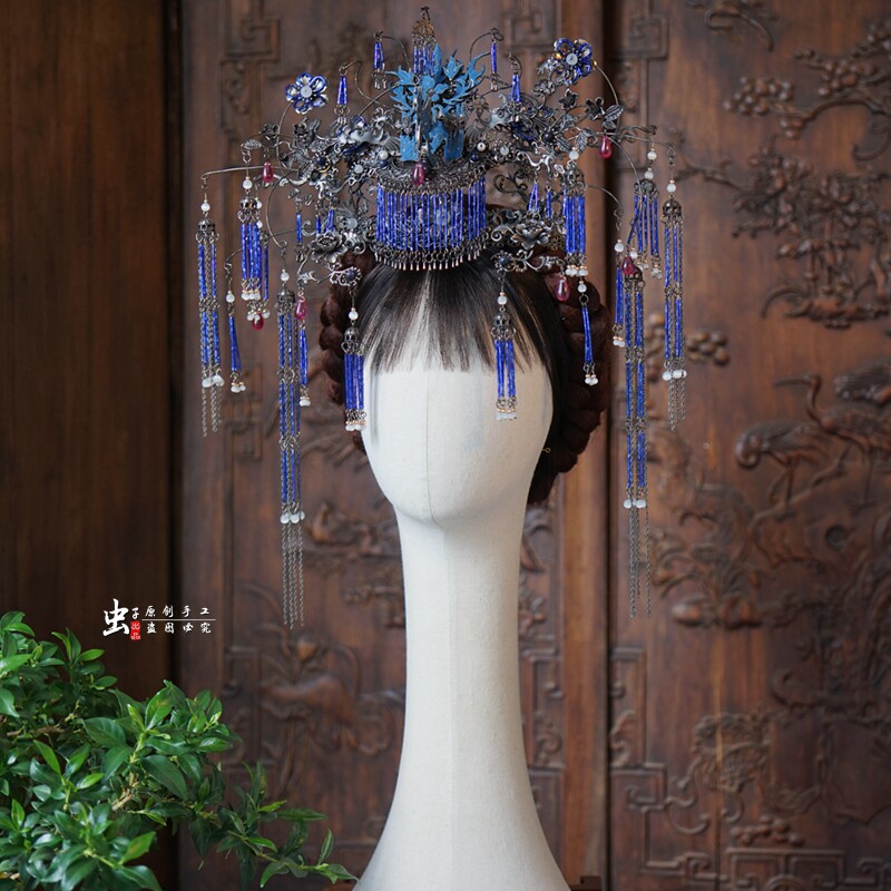 📚 虫子家墨蓝傩戏暗黑国风复古凤冠清汉女小众新娘头饰怪诞美学3221