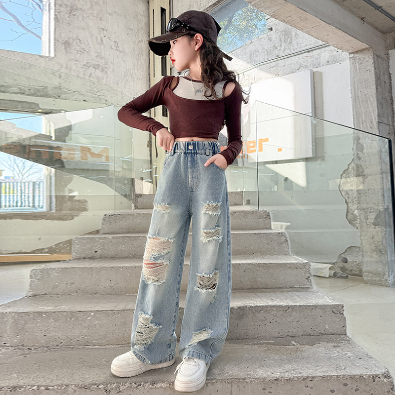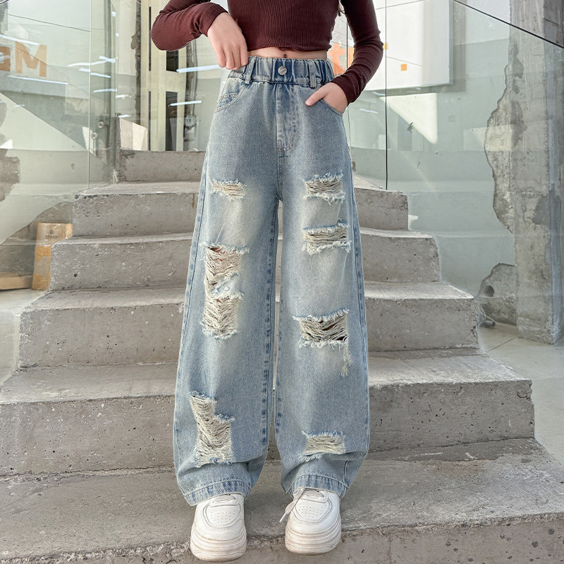 📚 女童牛仔裤春秋2025新款洋气大童春夏破洞乞丐裤子儿童宽松阔腿裤