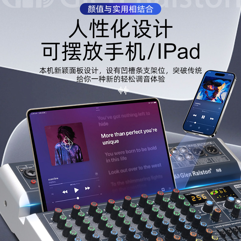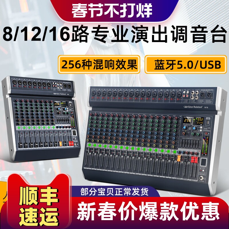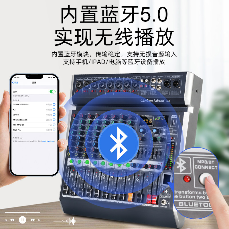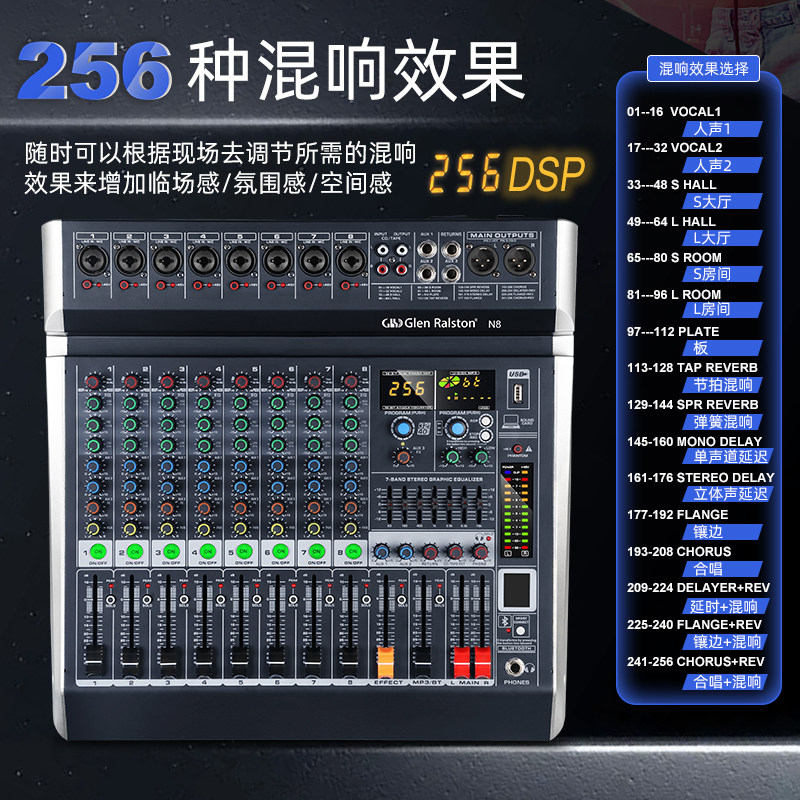 📚 格伦士顿8路专业调音台内置DSP效果带USB蓝牙混响舞台演出婚庆K歌