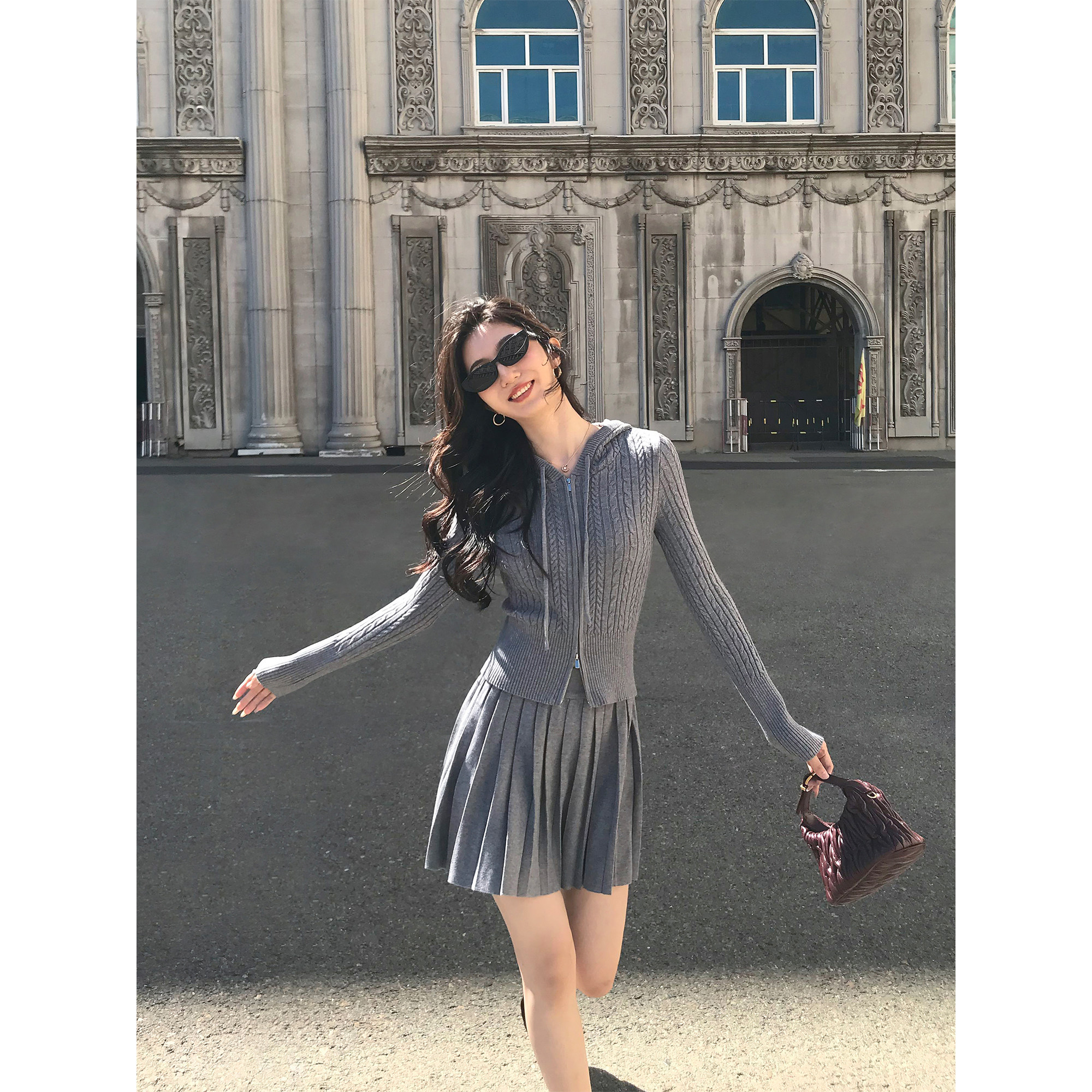 📚 MULVAN 拉夫学院 麻花连帽拉链针织开衫女上衣+a字百褶半身裙套装