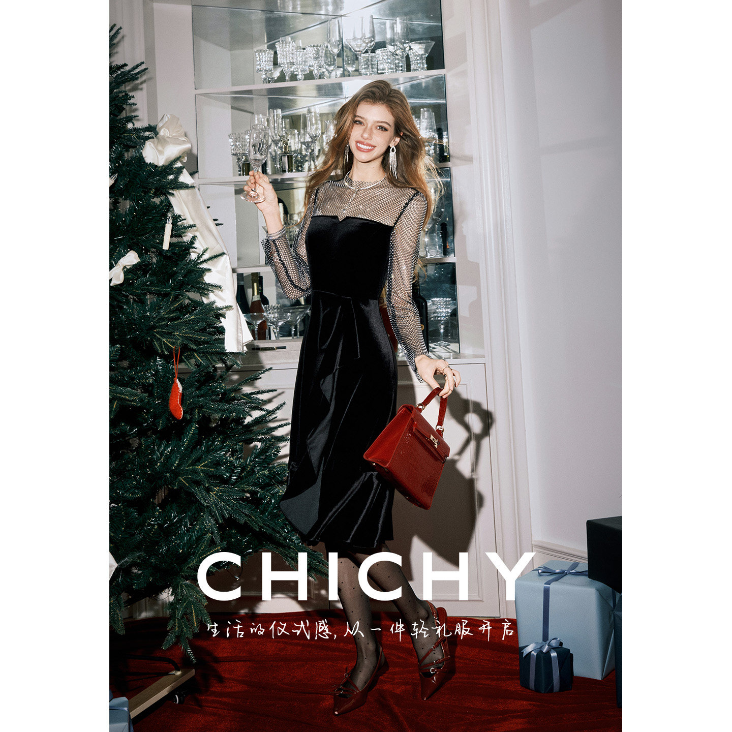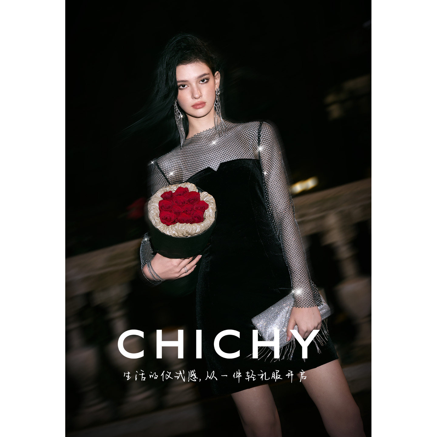 📚 CHICHY法式高级烫钻网纱丝绒连衣裙女26春季新款黑色修身宴会裙子