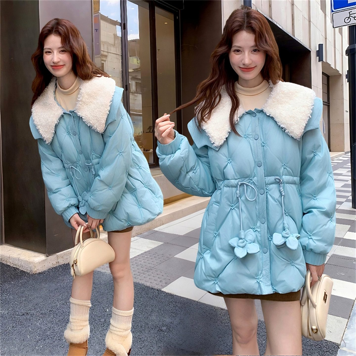 📚 加肥加大码羽绒服女刺绣网纱中长款娃娃领胖mm200斤抽绳收腰外套