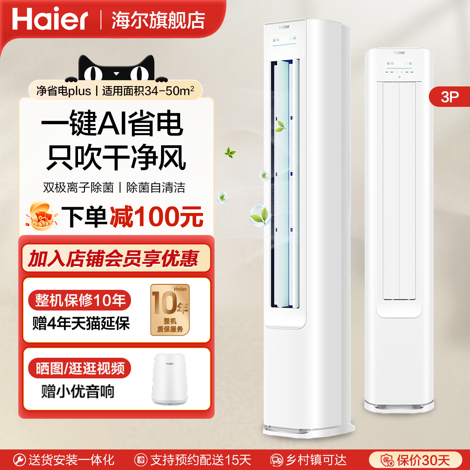 📚 海尔净省电Plus 3匹立式空调柜机家用变频新一级能效客厅冷暖两用