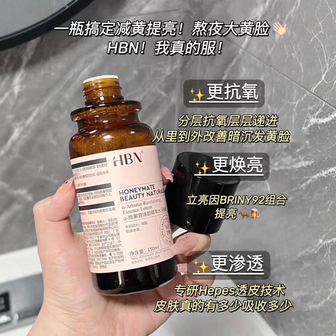 📚 HBN发光水熊果苷精粹水提亮肤色保湿爽肤水湿敷护肤精华水正品2.0