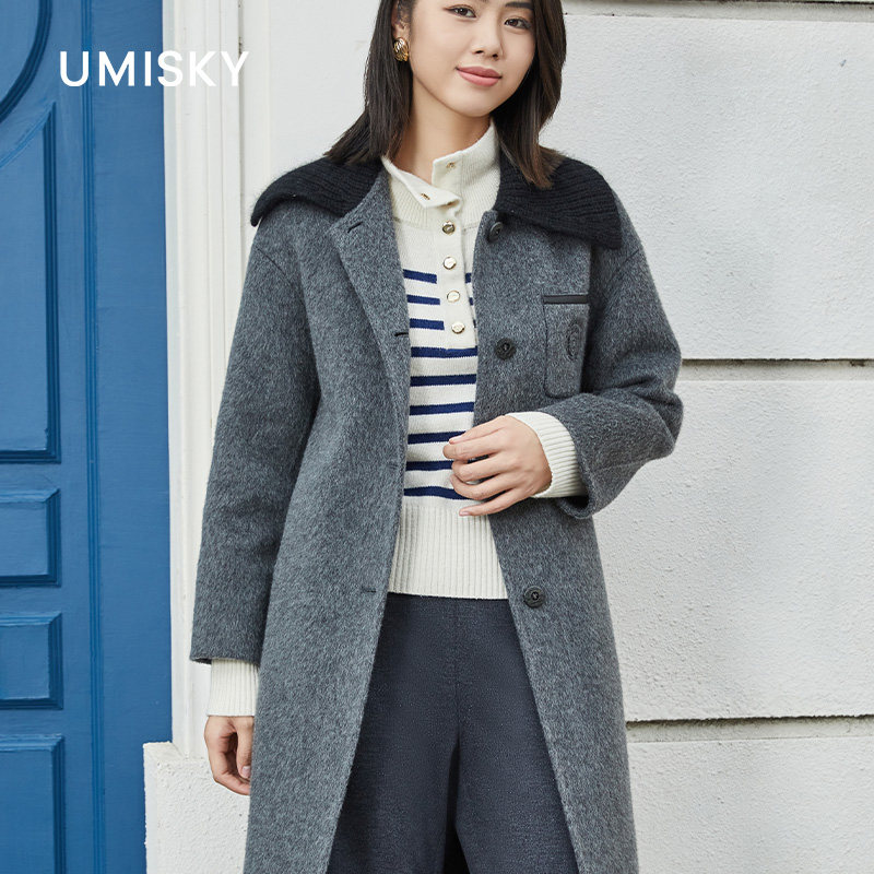 📚 umisky优美世界专柜同款冬季黑毛领大衣复古中长毛呢外套SK4E2205