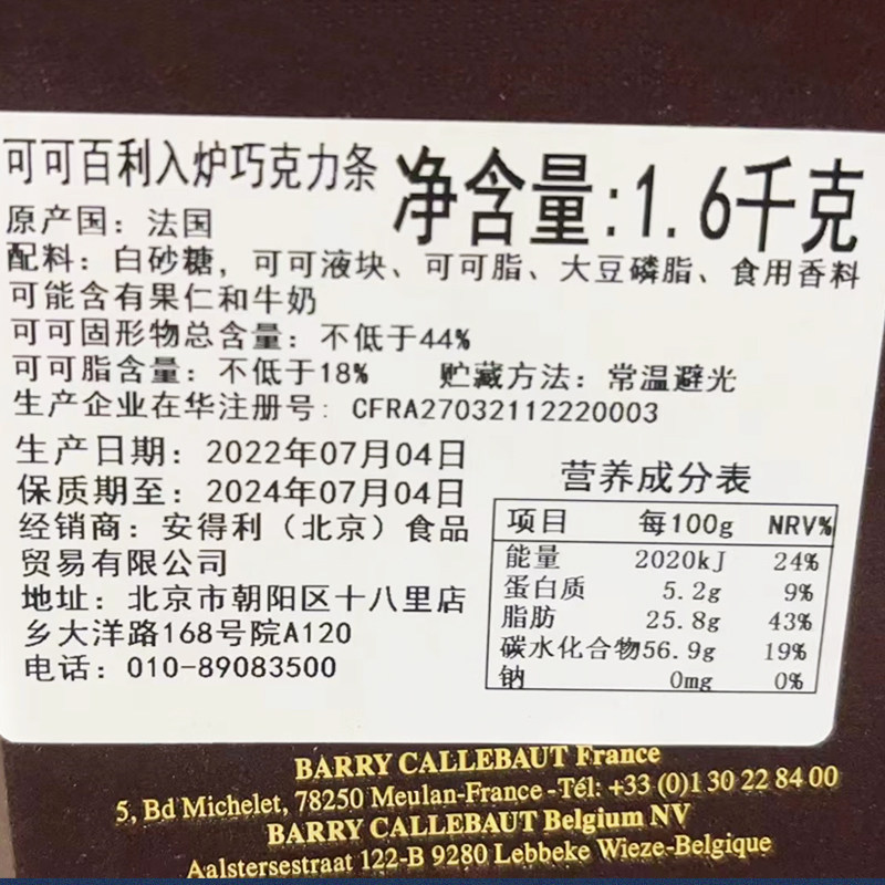📚 可可百利44%耐烤入炉黑巧克力条1.6kg 法国进口耐高温烘焙巧克力