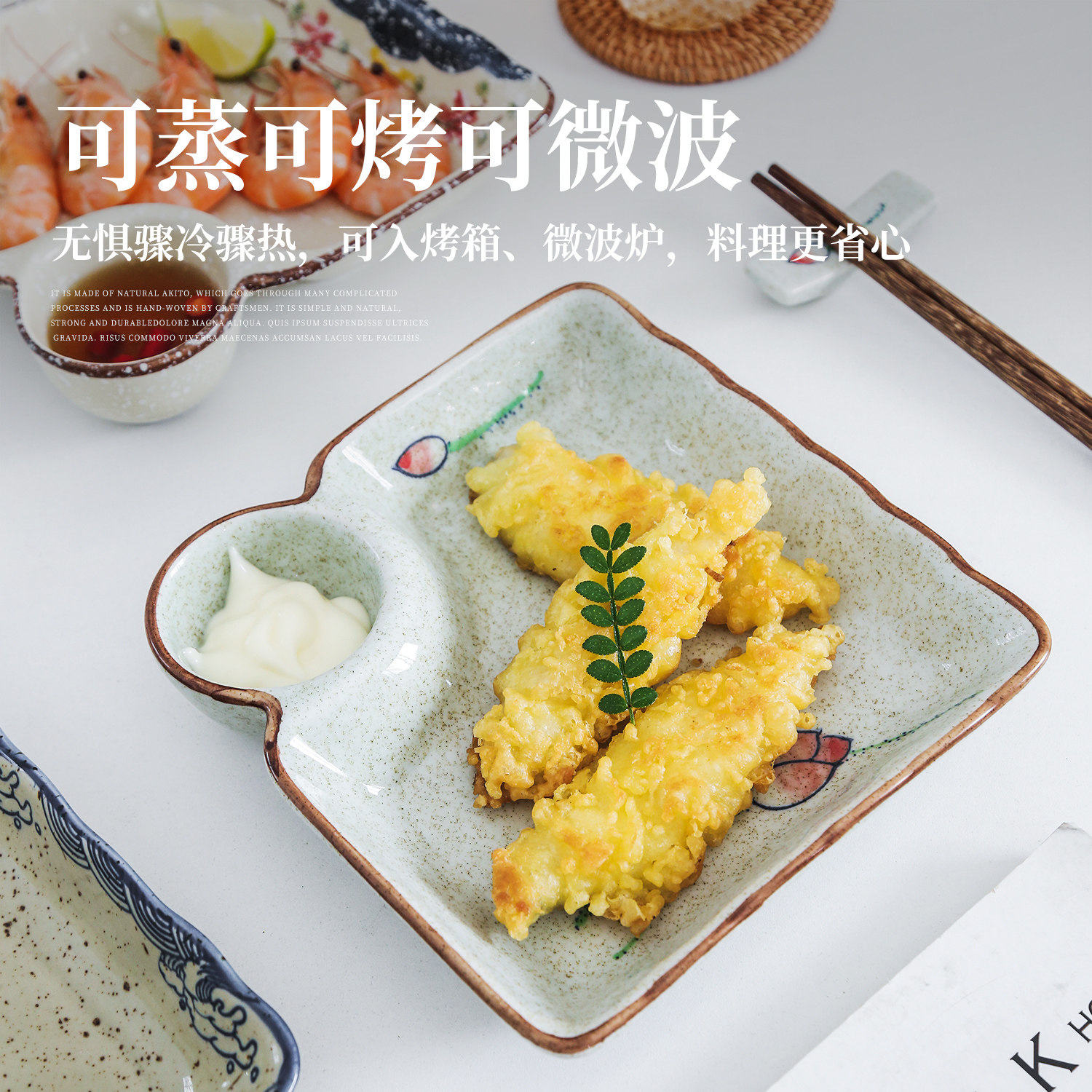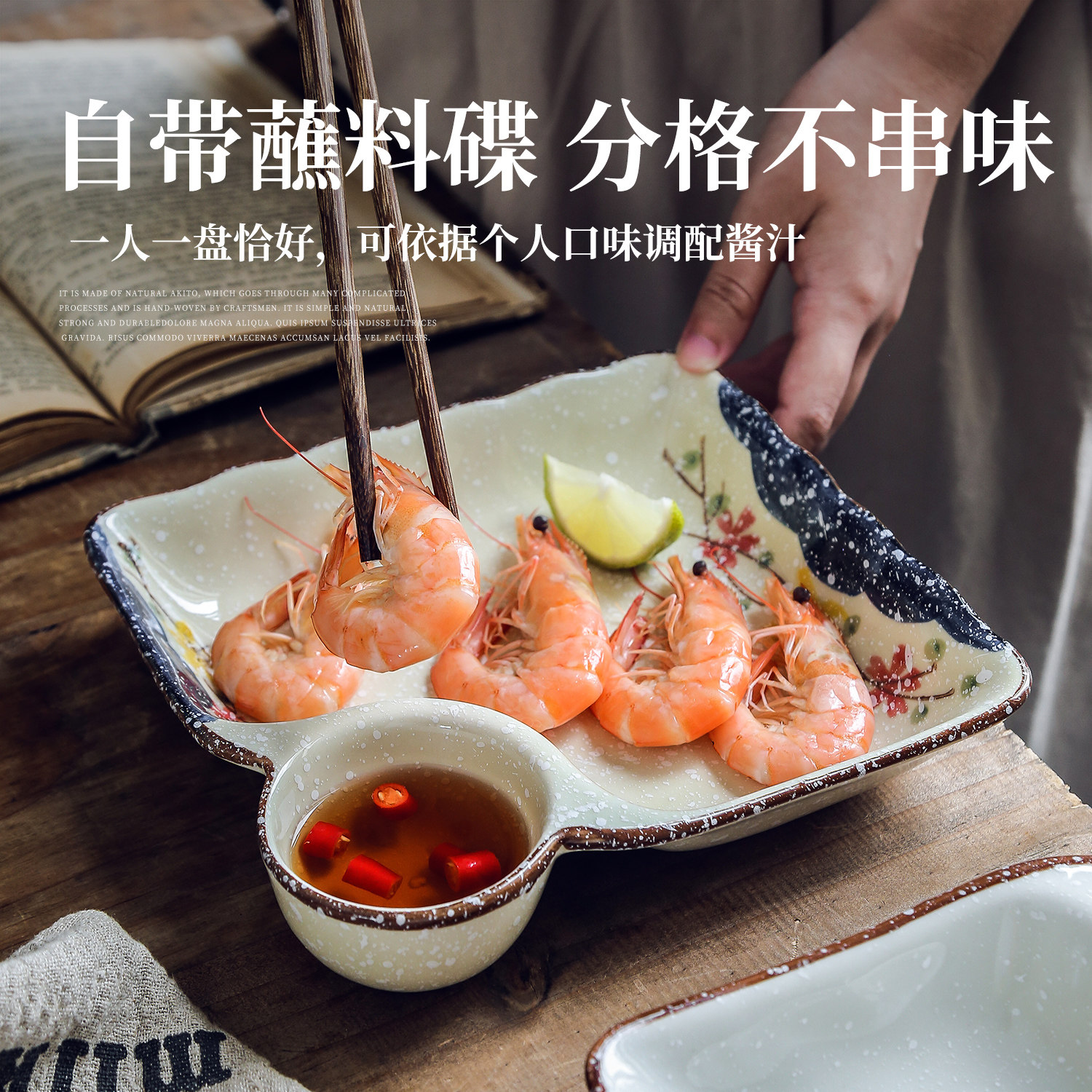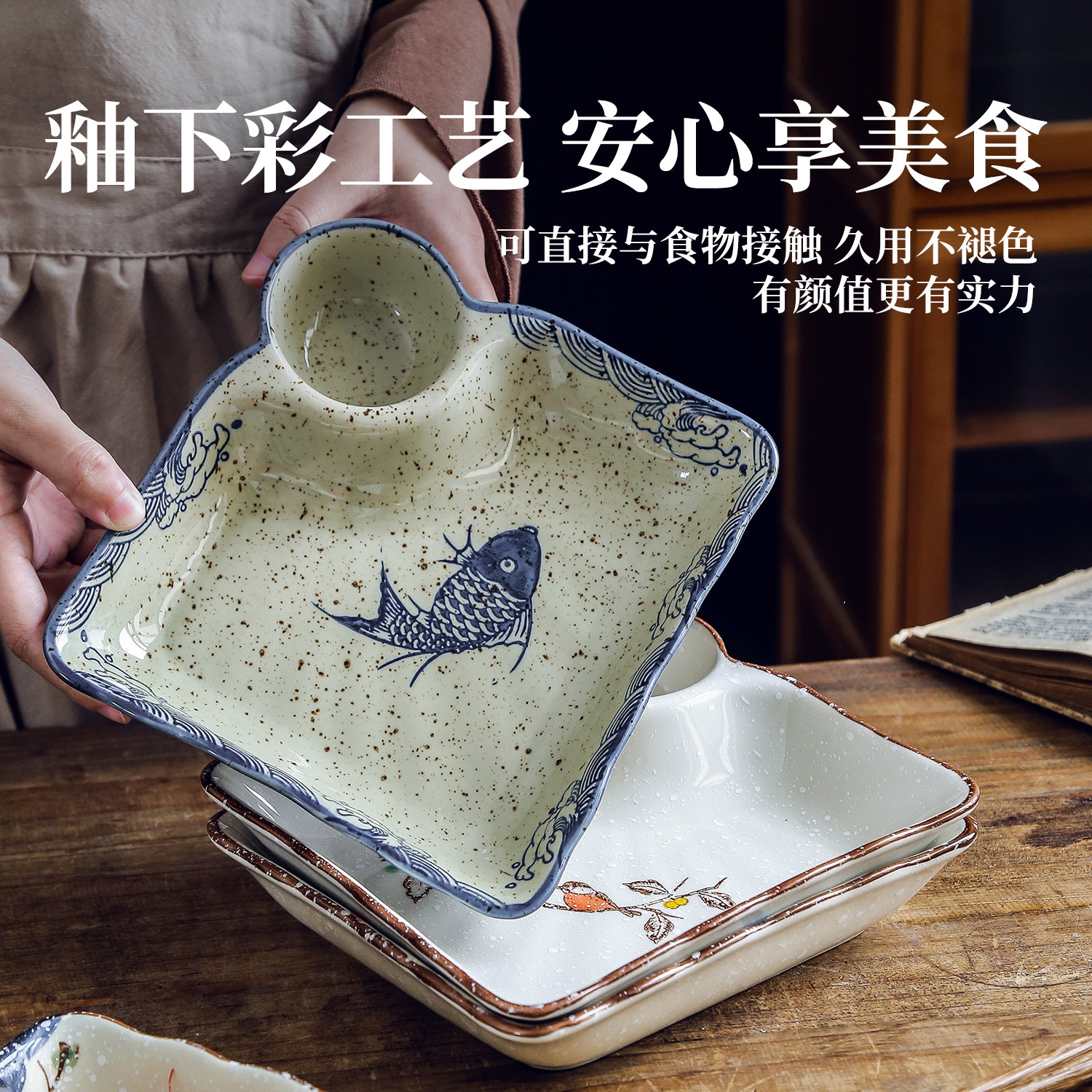 📚 复古饺子盘家用水饺专用盘带醋碟蘸料碟方形早餐盘陶瓷寿司盘摆盘