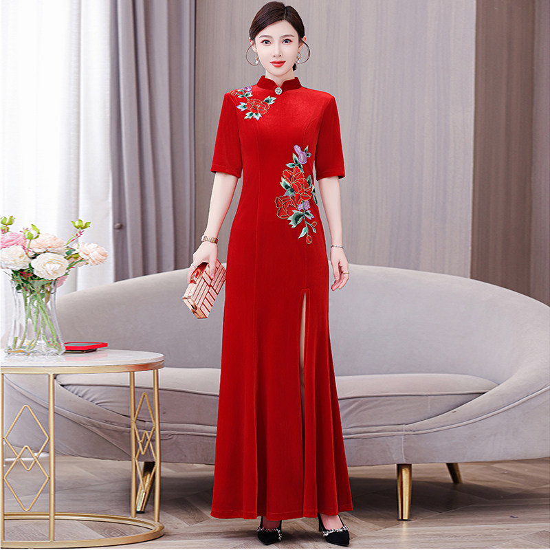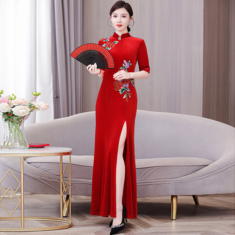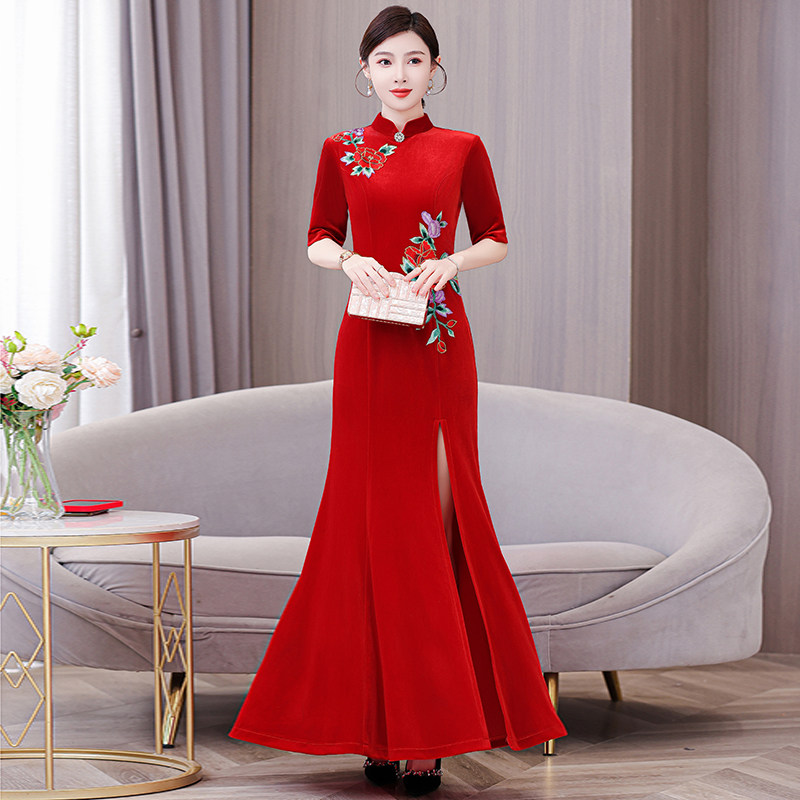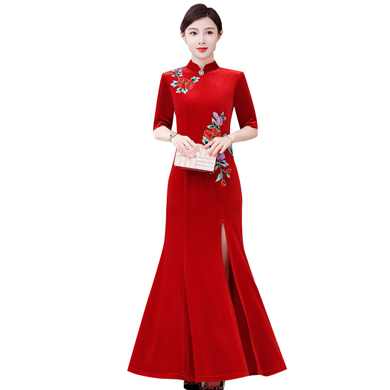 📚 走秀旗袍新款高端优雅气质红色长款舞台表演服改良弹力大码形体服