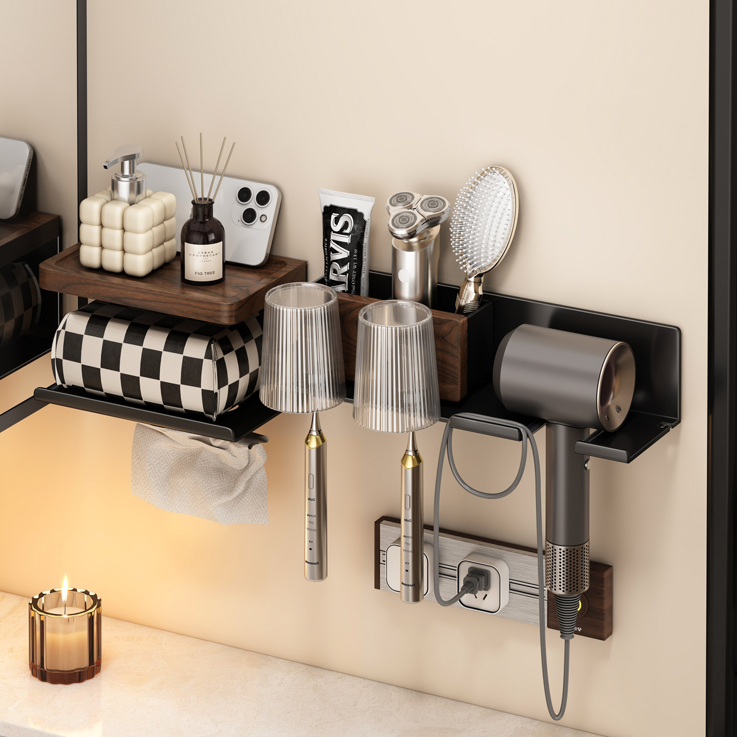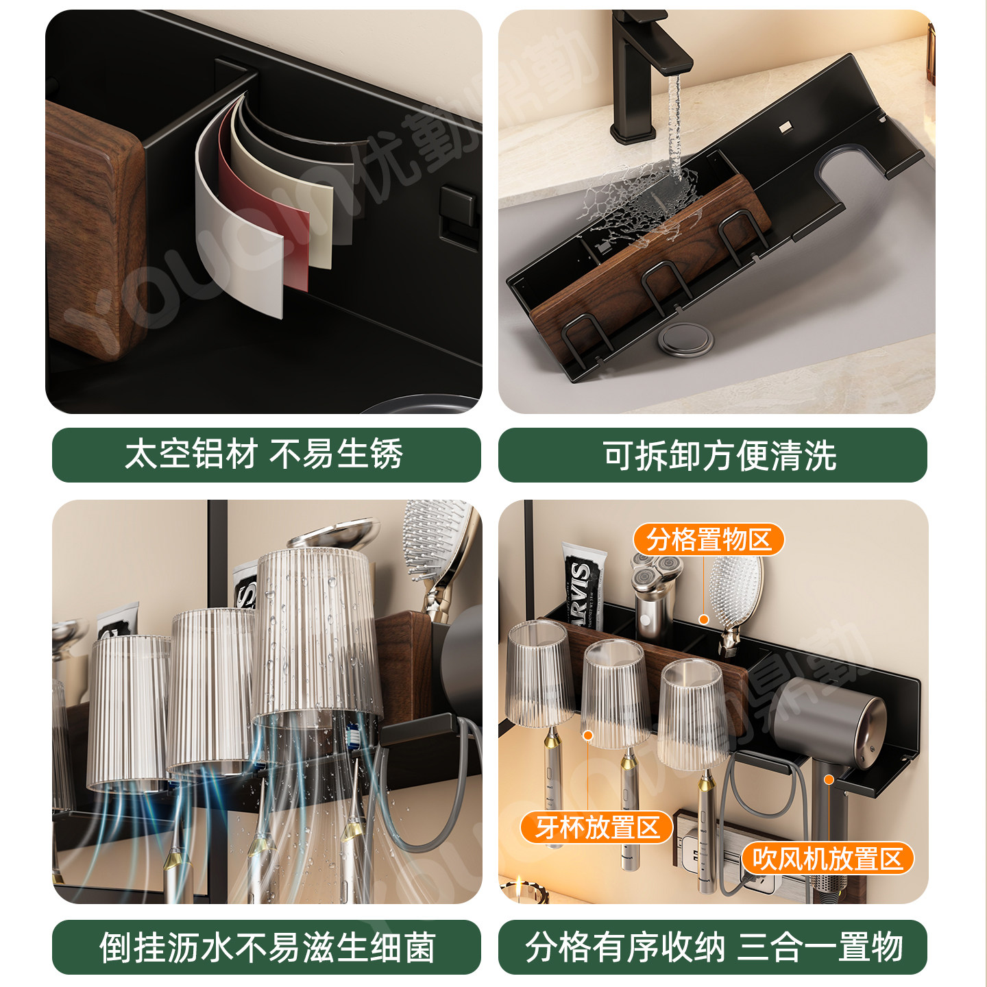 📚 胡桃木牙刷置物架中古风卫生间洗漱台免打孔牙刷洗脸巾收纳置物架