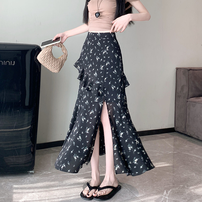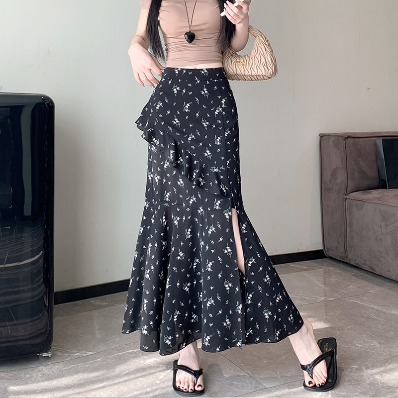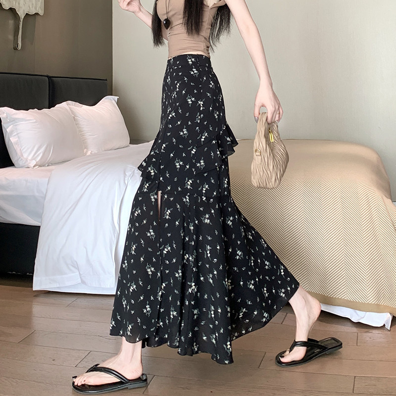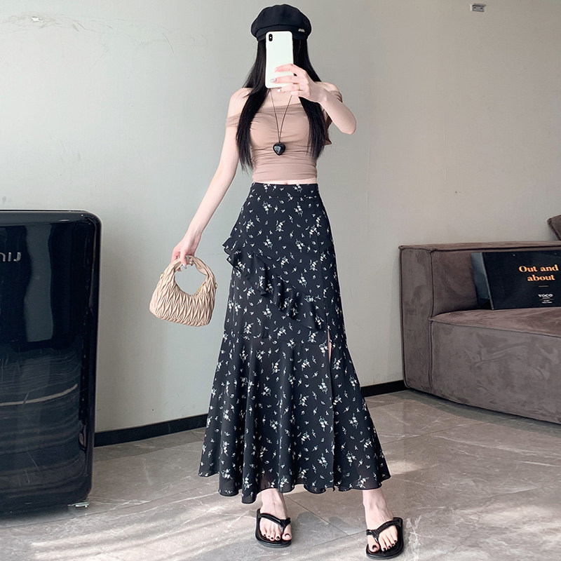 📚 2026新款上市春款韩版印花花边半身裙女碎花中长款高腰开叉鱼尾裙