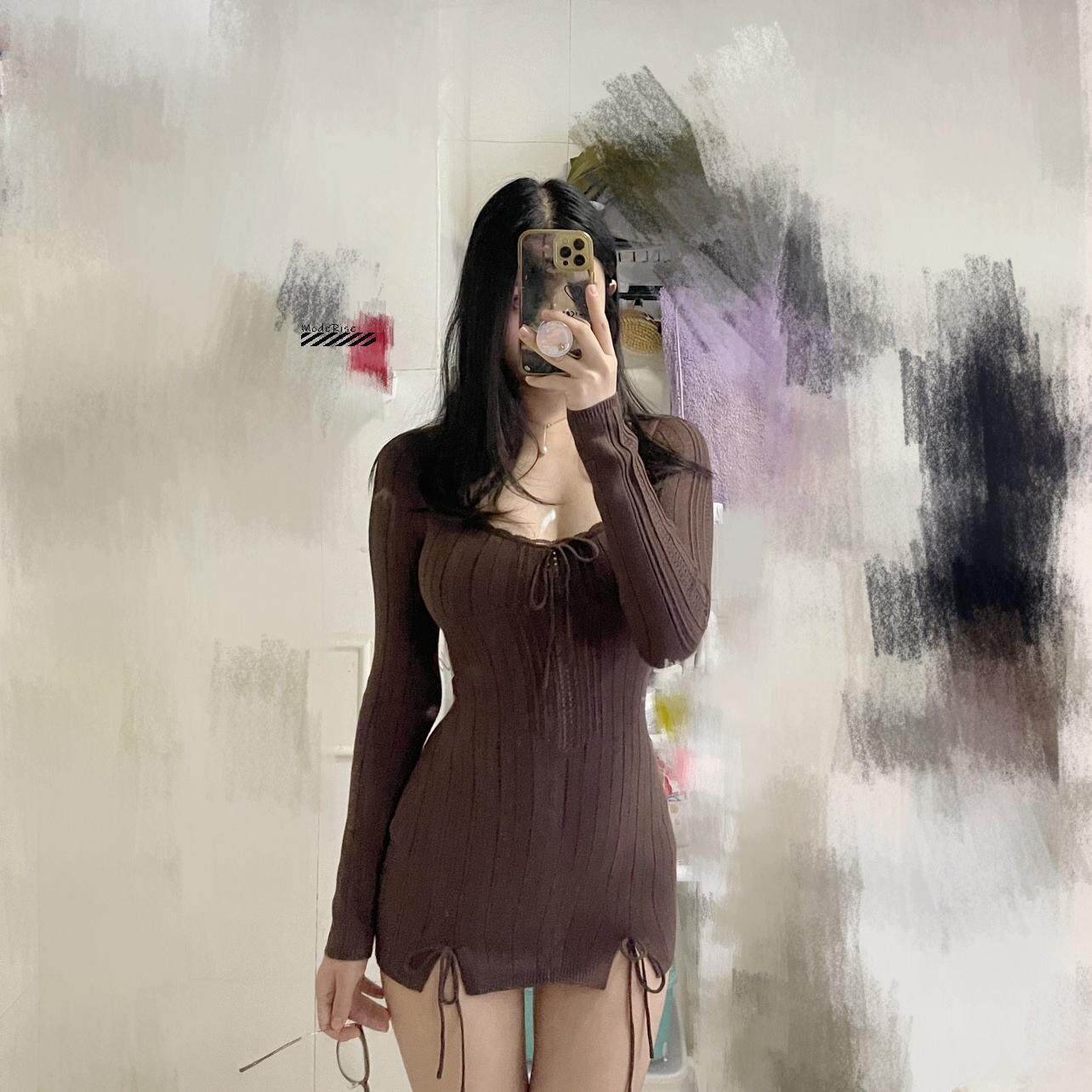 📚 【现6折】Danielle Guizio性感针织蕾丝大U领短裙 镂空系带花边裙
