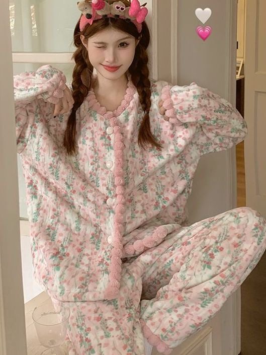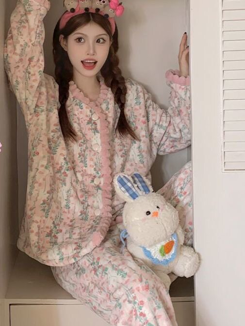 📚 特大码胖MM复古花朵珊瑚绒睡衣女款冬季加绒加厚法兰绒秋家居服
