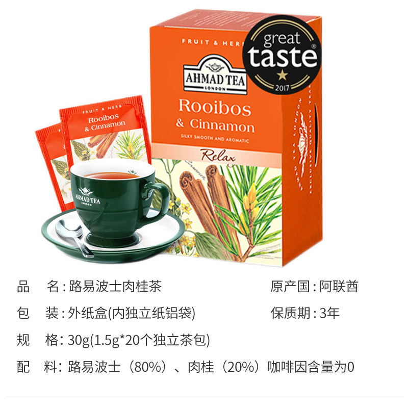 📚 AHMAD TEA亚曼肉桂路易波士20入无咖啡因无蔗糖独立袋泡茶养生茶