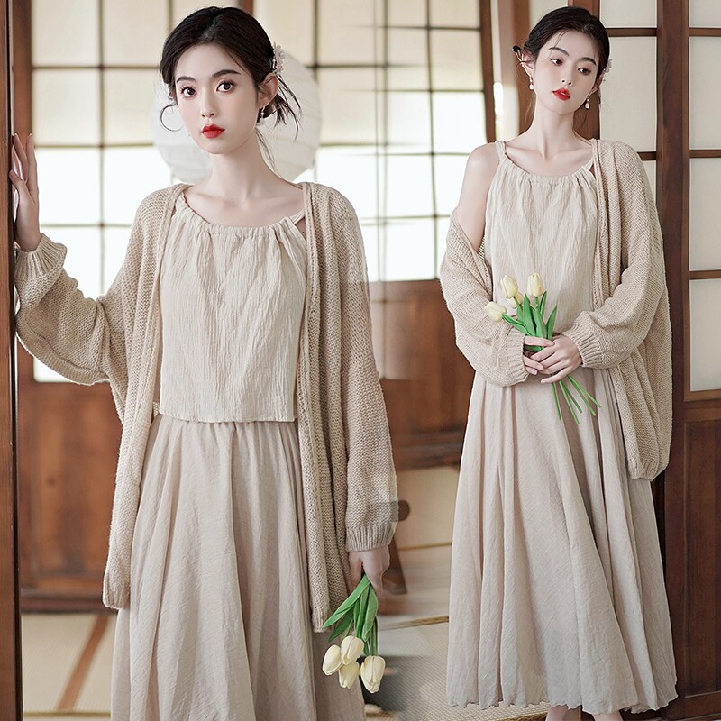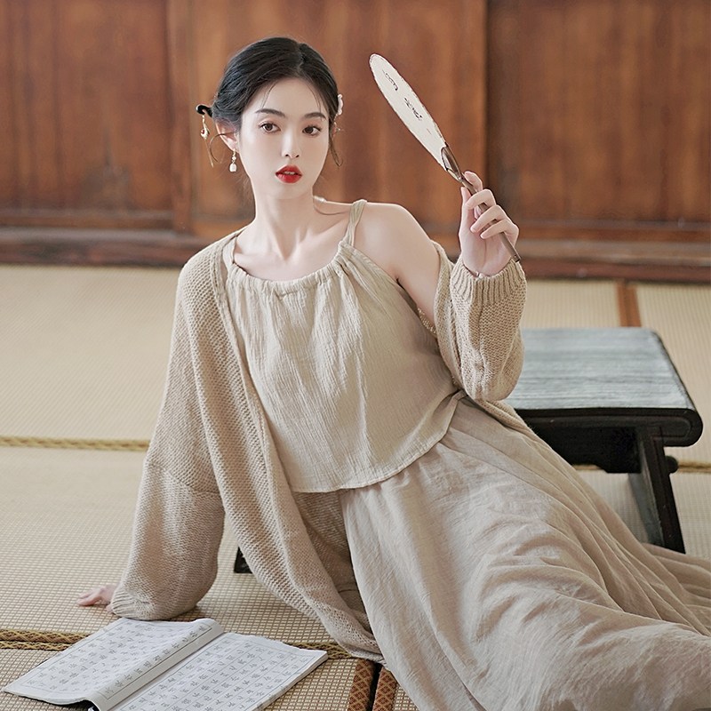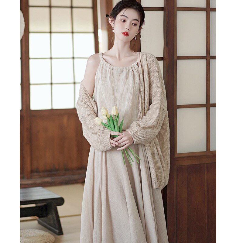 📚 棉麻吊带禅意亚麻女装套装古镇中式三件套春夏秋季连衣裙外套茶艺