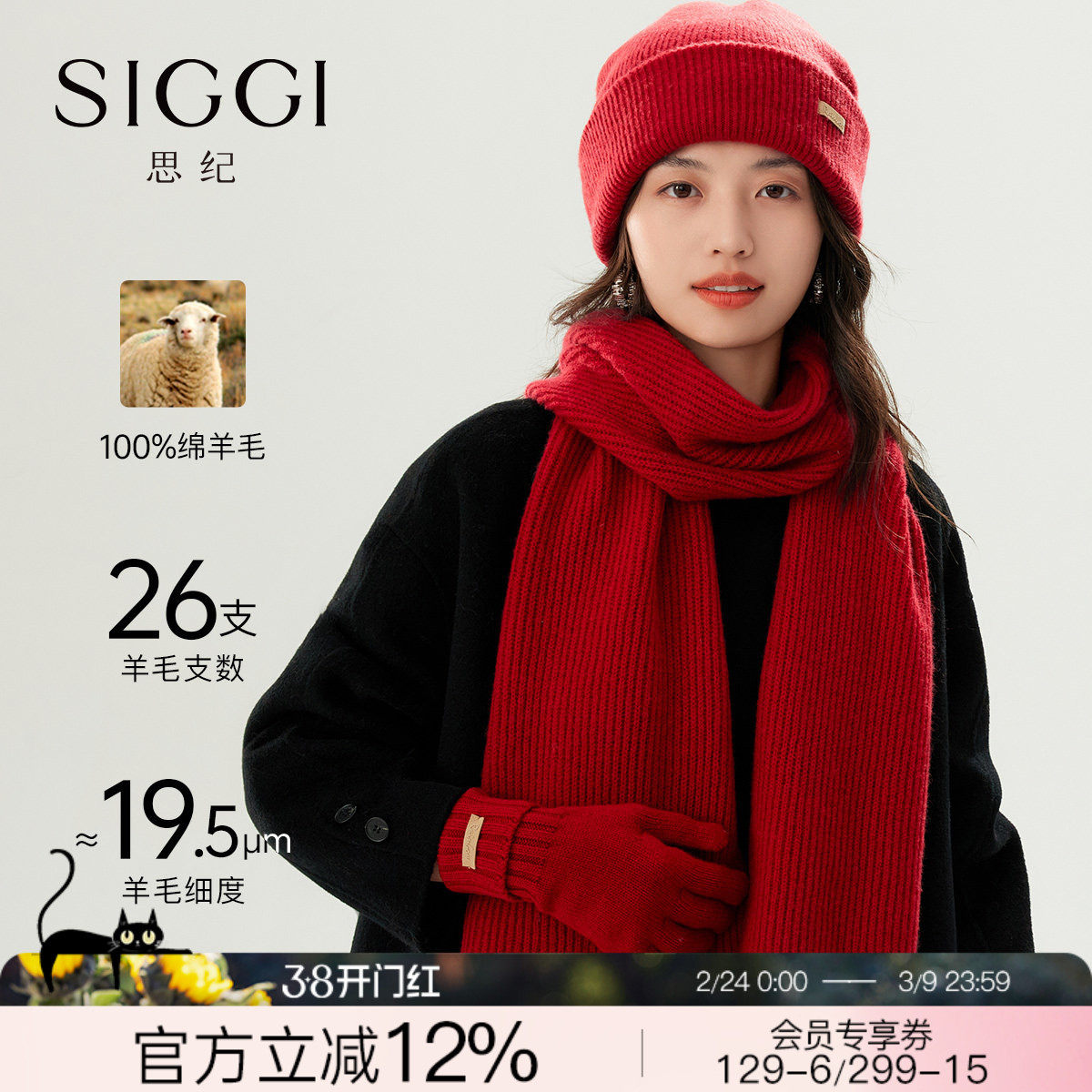 📚 siggi 羊毛围巾手套帽子三件套女冬加厚保暖针织帽马年新年红礼物