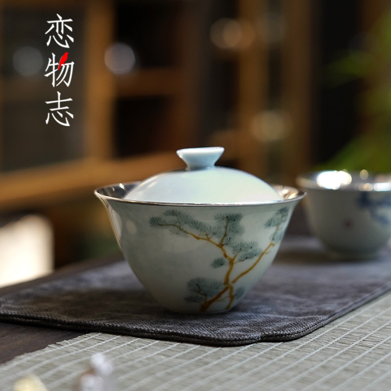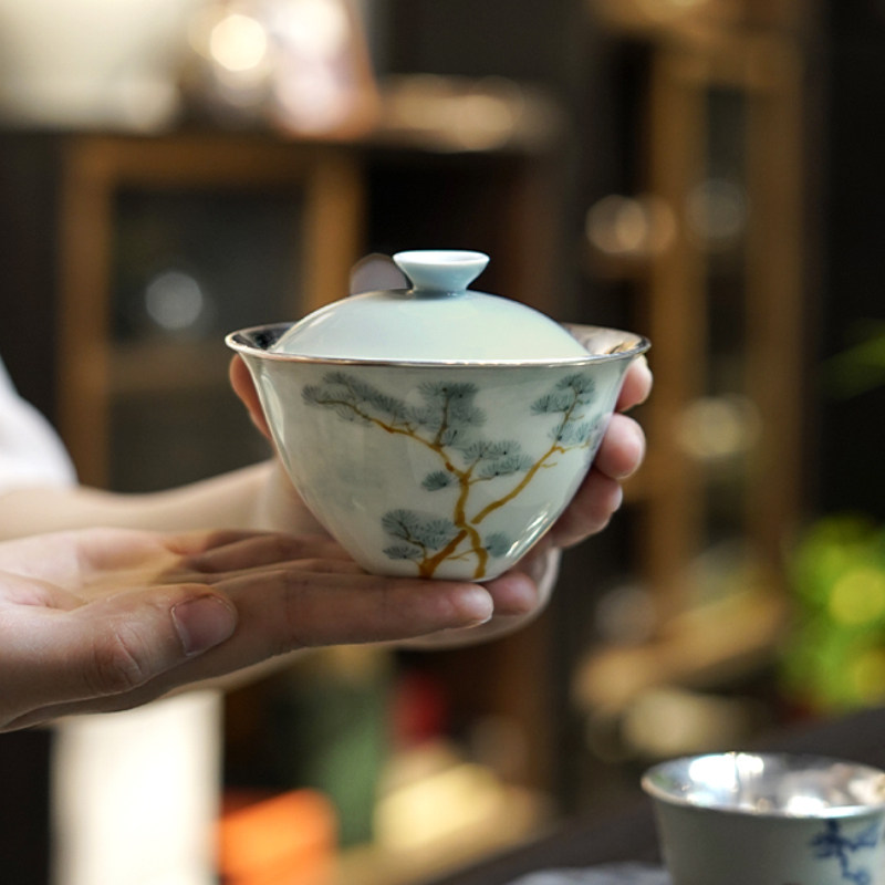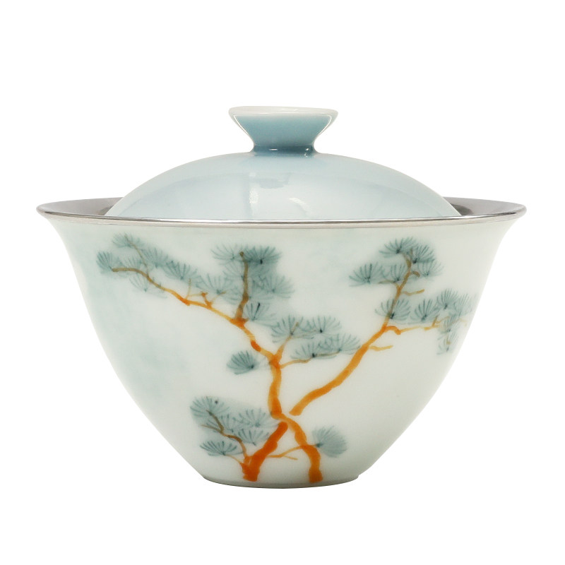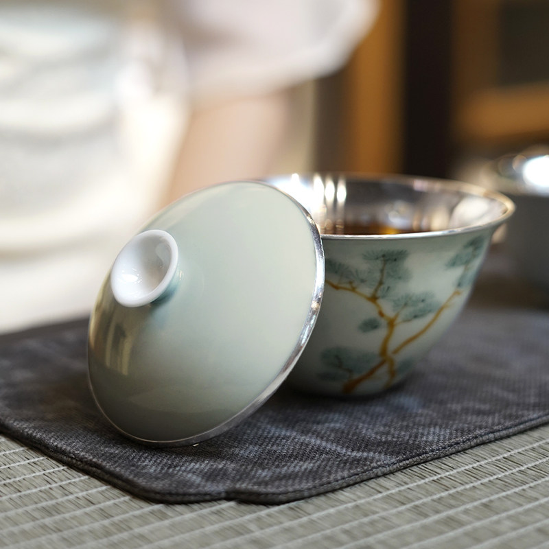 📚 盖碗纯银999手抓壶手绘纯手工包银盖碗景德镇手绘功夫茶具 岚松