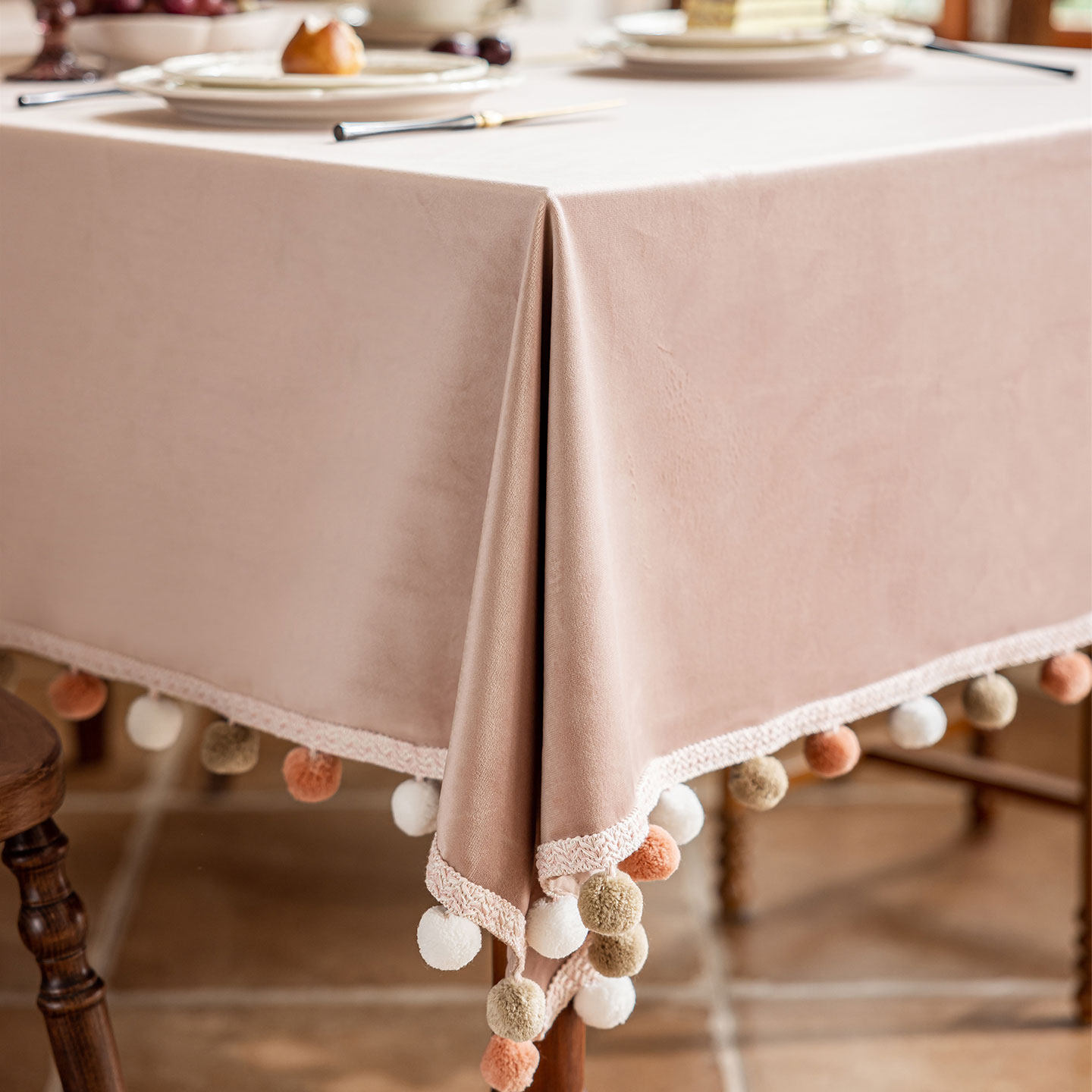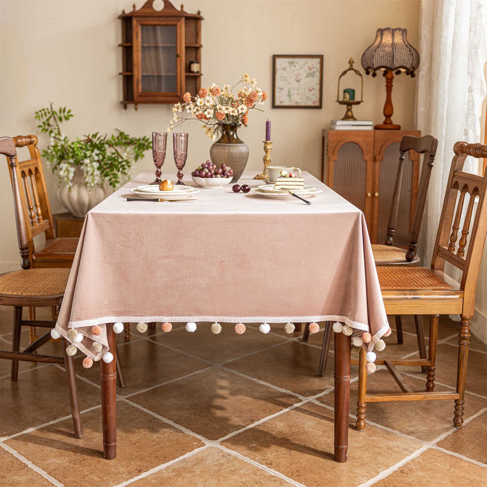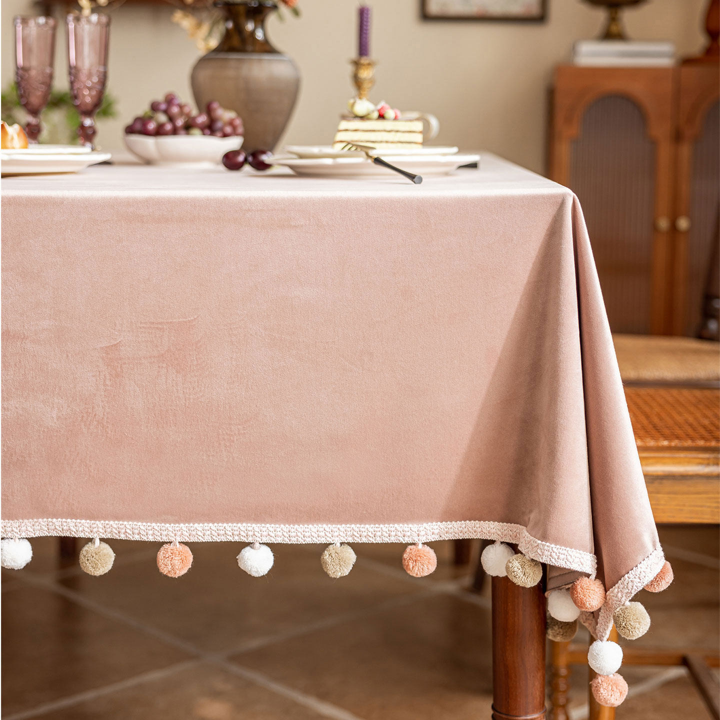 📚 毛球边 粉色丝绒桌布甜品台茶歇台布户外婚礼装饰生日甜品台桌布