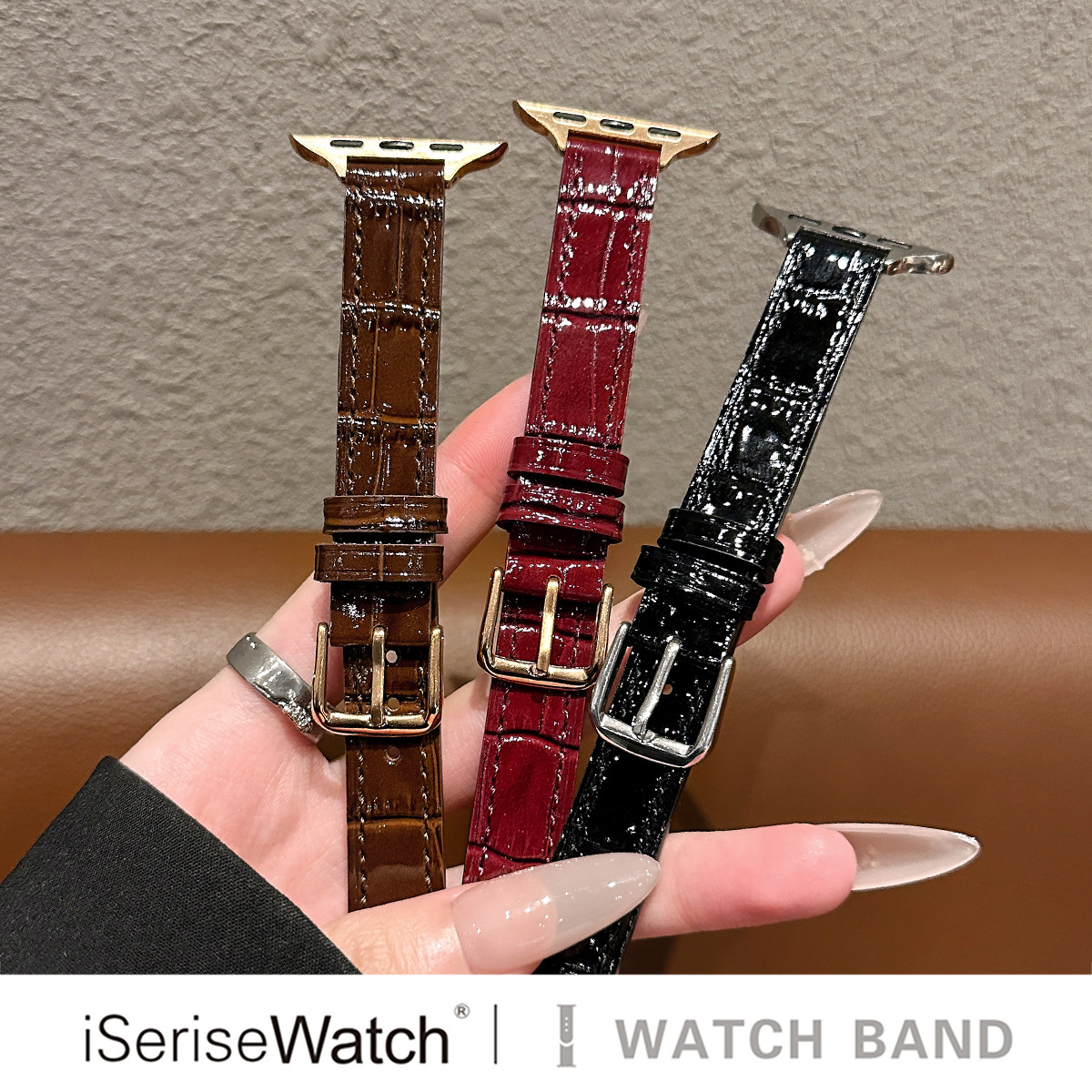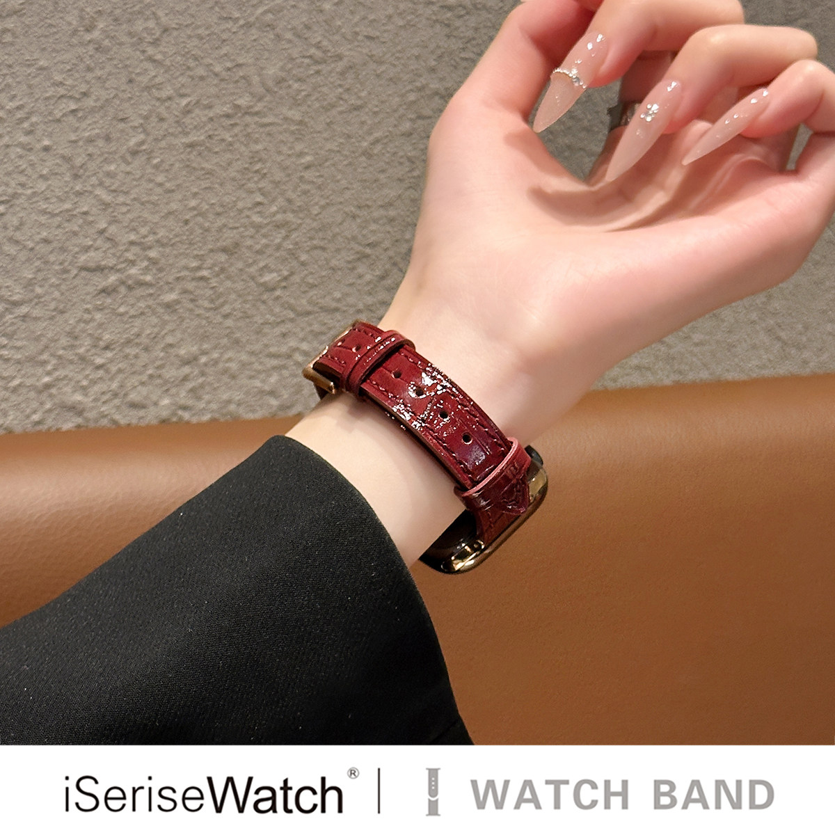 📚 iserisewatch适用于apple watchs11表带竹节纹亮面皮质se复古高级苹果手表s10表带iwatch 7/6酒红色秋冬女款
