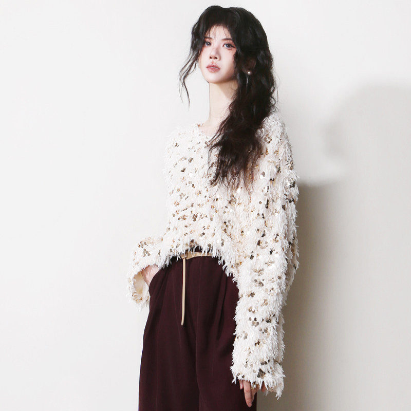 📚 A15温柔闪闪bling亮片羽毛毛绒飘逸宽松圆领套头欧美风毛衣针织衫