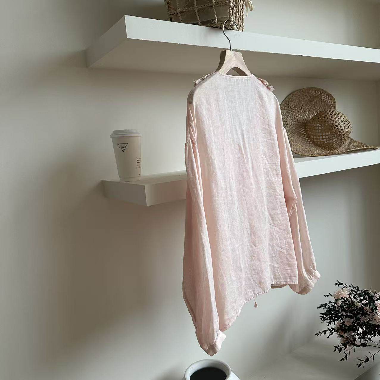 📚 温温原创 W2552-花边领手工压褶时尚休闲百搭宽松V领长袖衬衫上衣