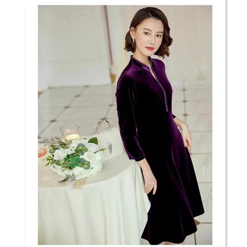📚 秋冬季商场同款时尚简约改良旗袍款气质高贵丝绒时尚中长连衣裙子