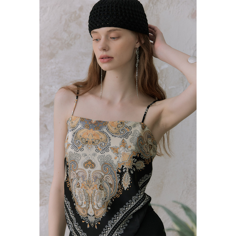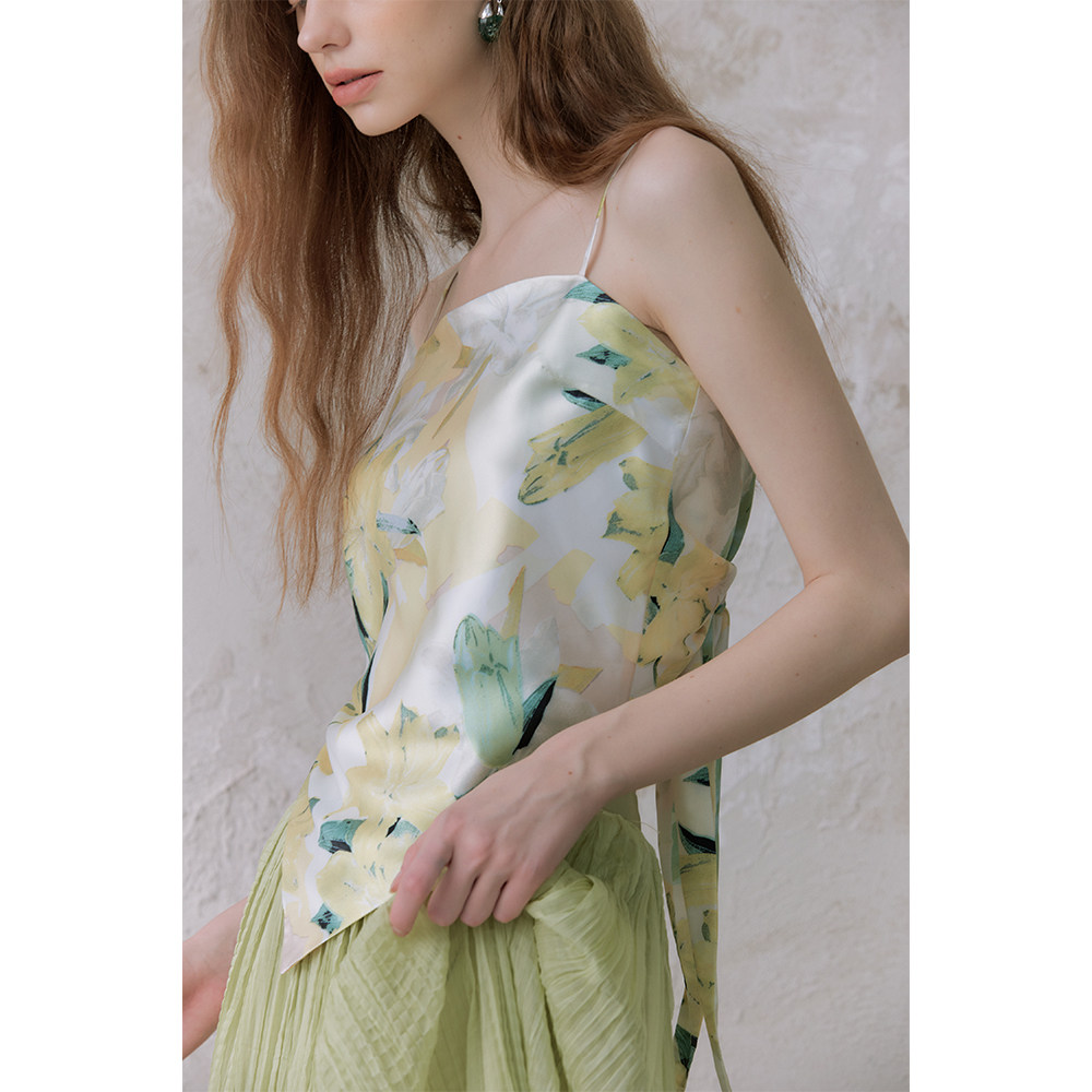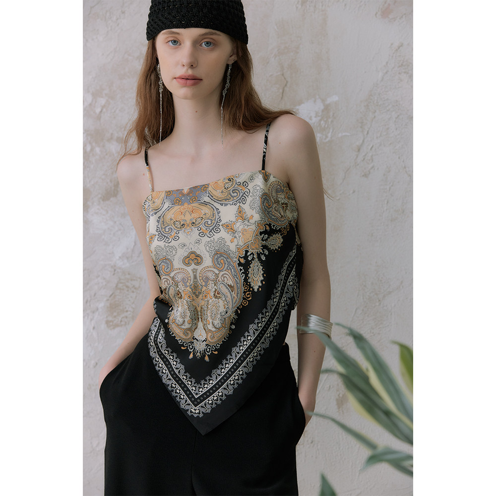 📚 奥芝国 四种花色 缎面印花丝巾式后背打结吊带设计感不规则上衣