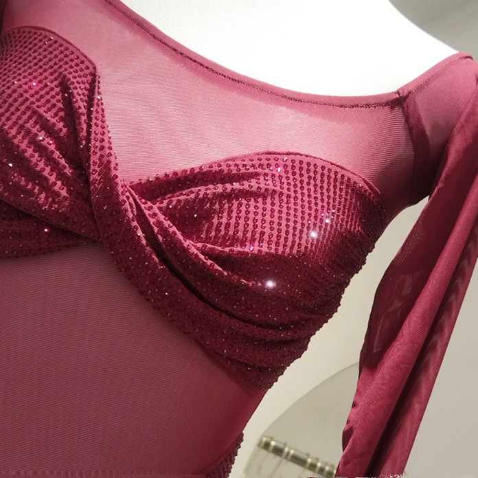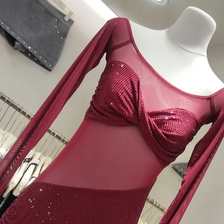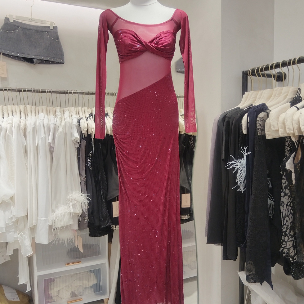 📚 澳洲小众性感闪闪烫钻一字肩连衣裙女轻奢红色礼服party露背长裙