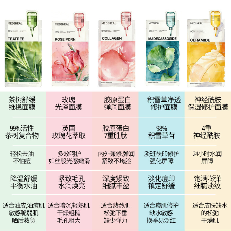 📚 韩国MEDIHEAL美迪惠尔面膜积雪草补水茶树玻尿酸胶原蛋白舒缓提亮