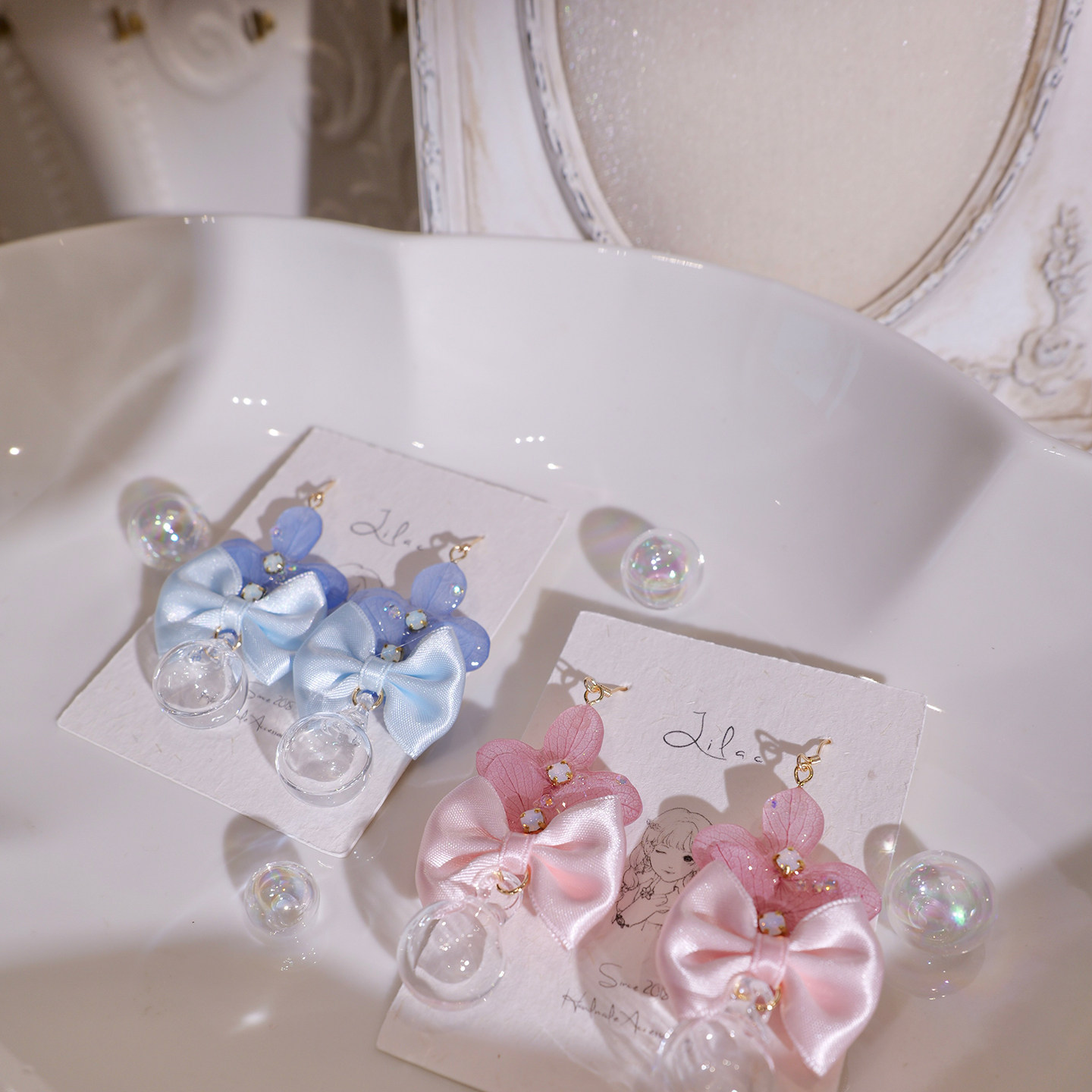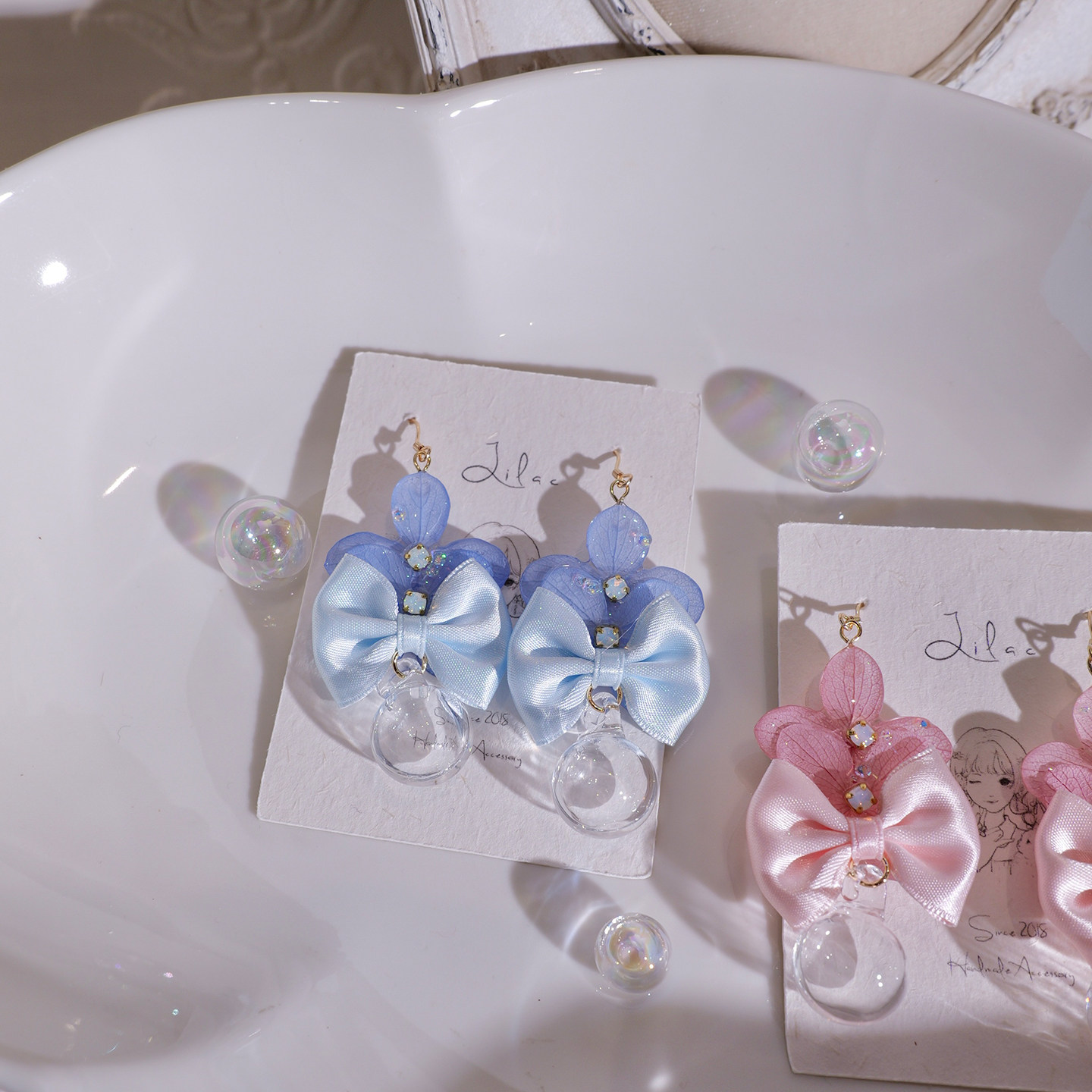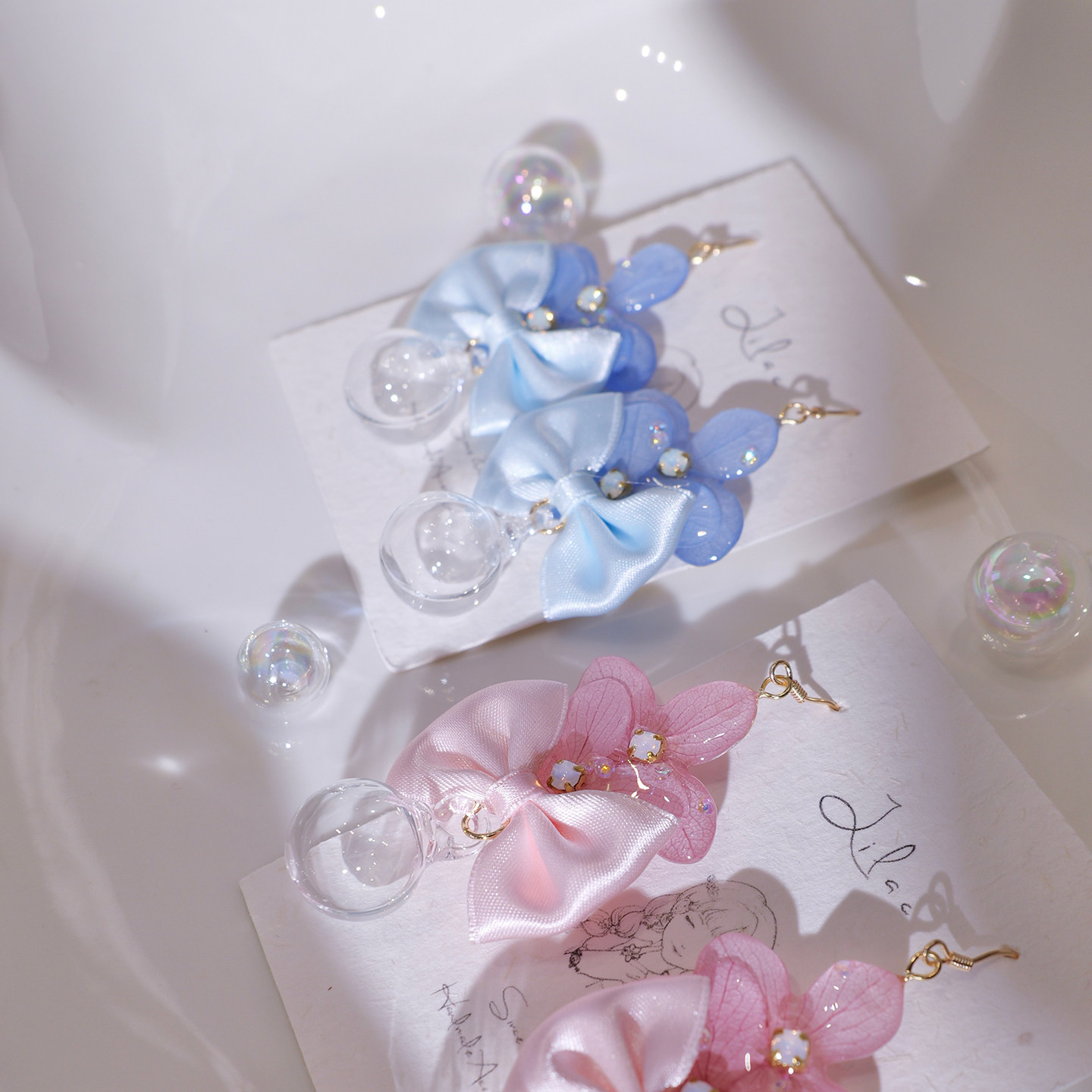 📚 LILAC原创手作甜美可爱蝴蝶结蓝色花朵粉色真花水球丝带耳钉耳环