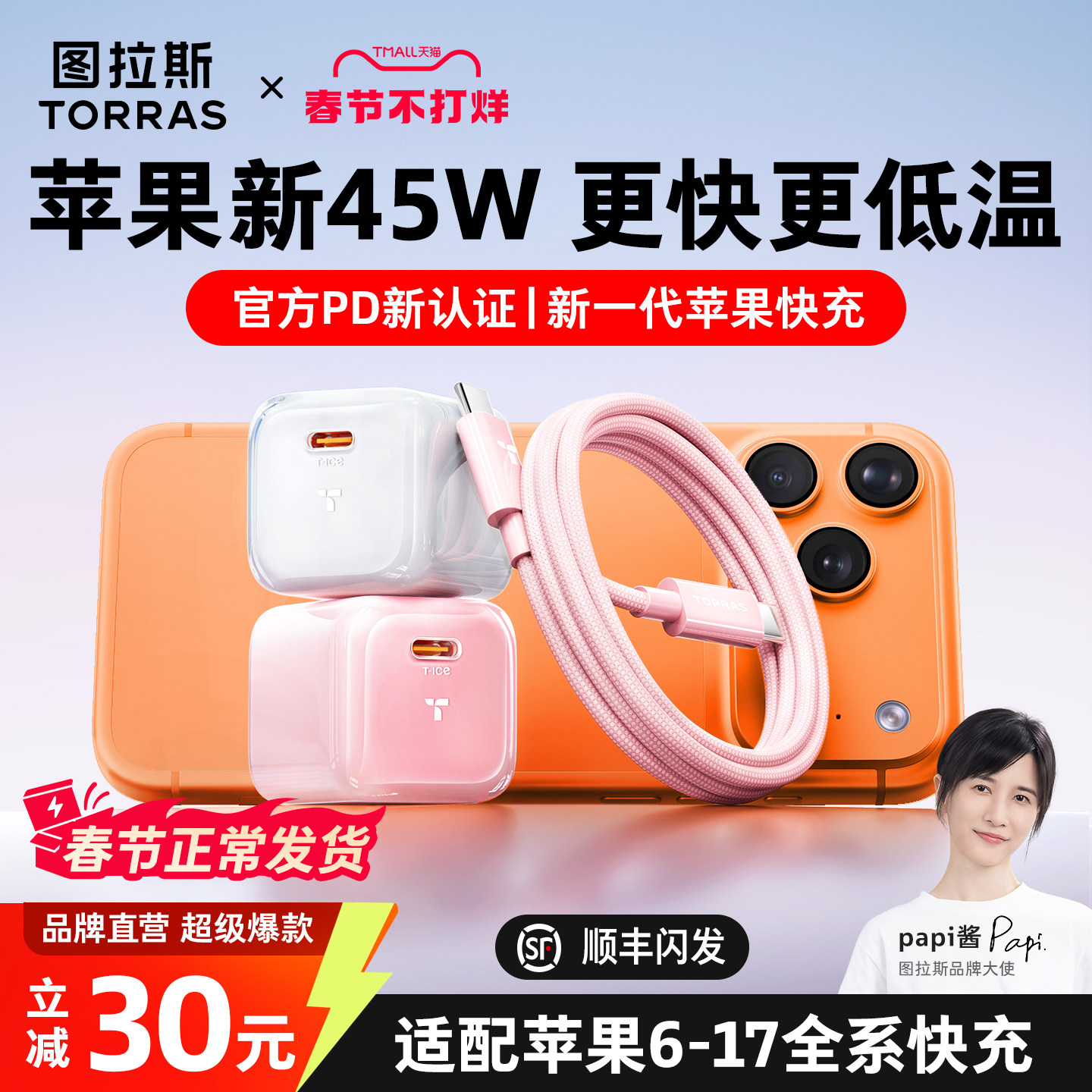 📚 【papi酱同款】图拉斯小冰块lite新款45W适用苹果充电器线iPhone17ProMax手机Air正品16快充头一套40W数据线