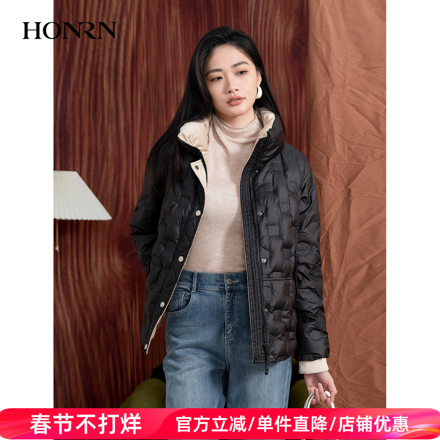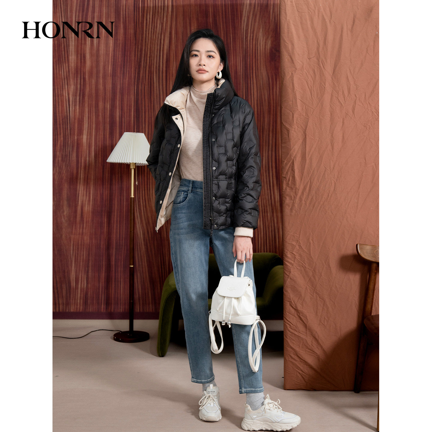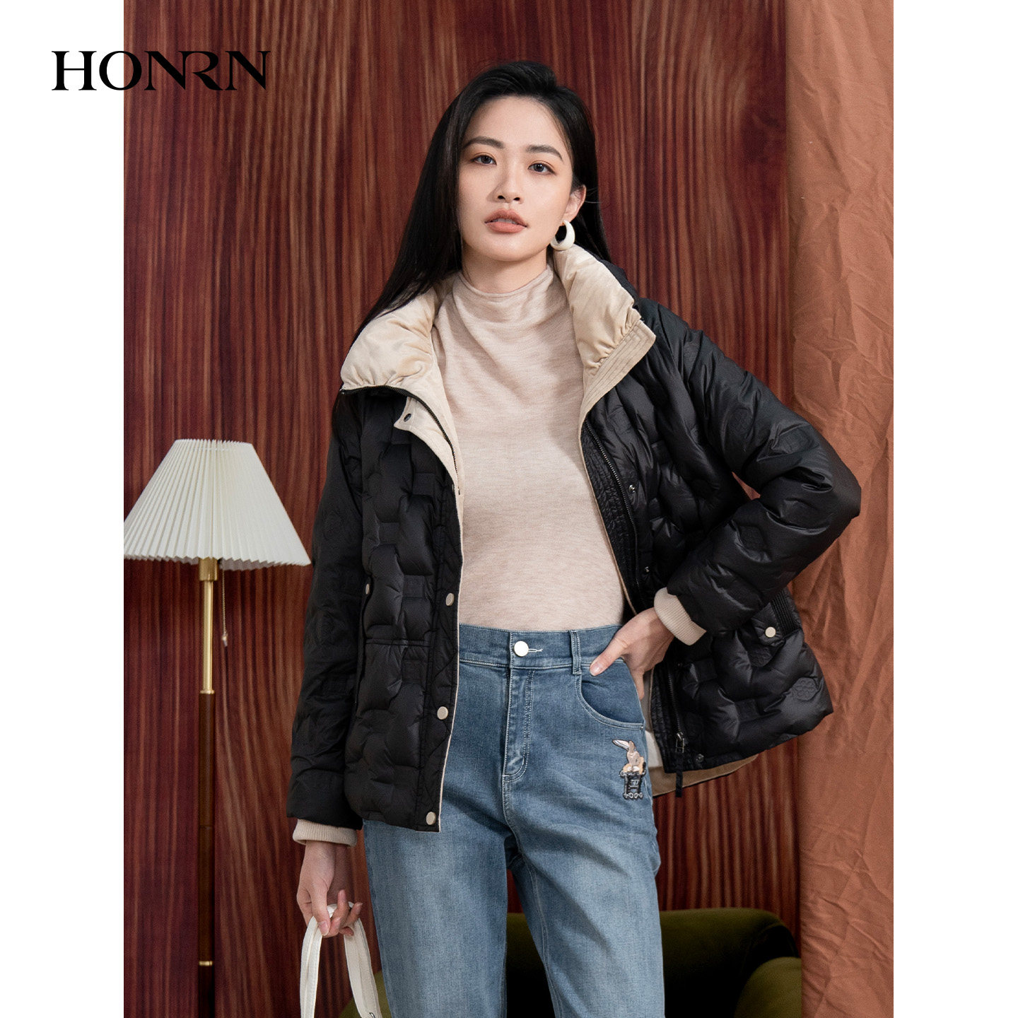 📚 HONRN/红人黑色保暖短款立领白鸭绒羽绒服外套女款冬季HI55YR251