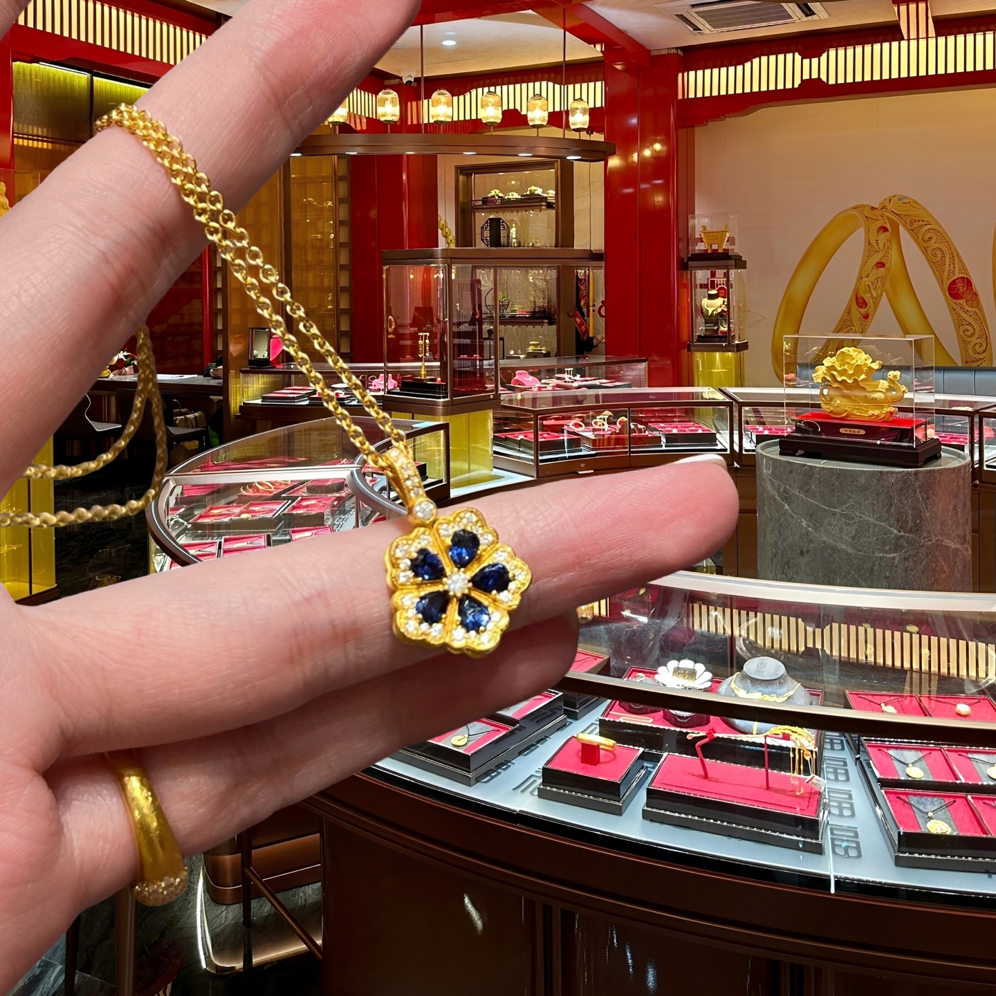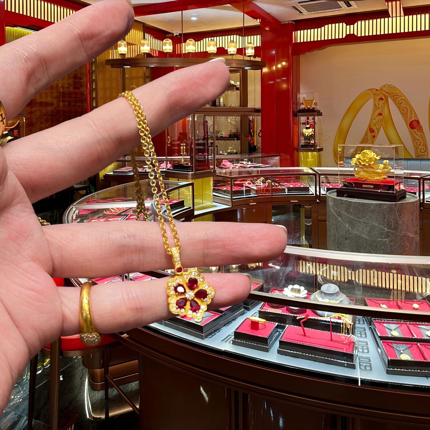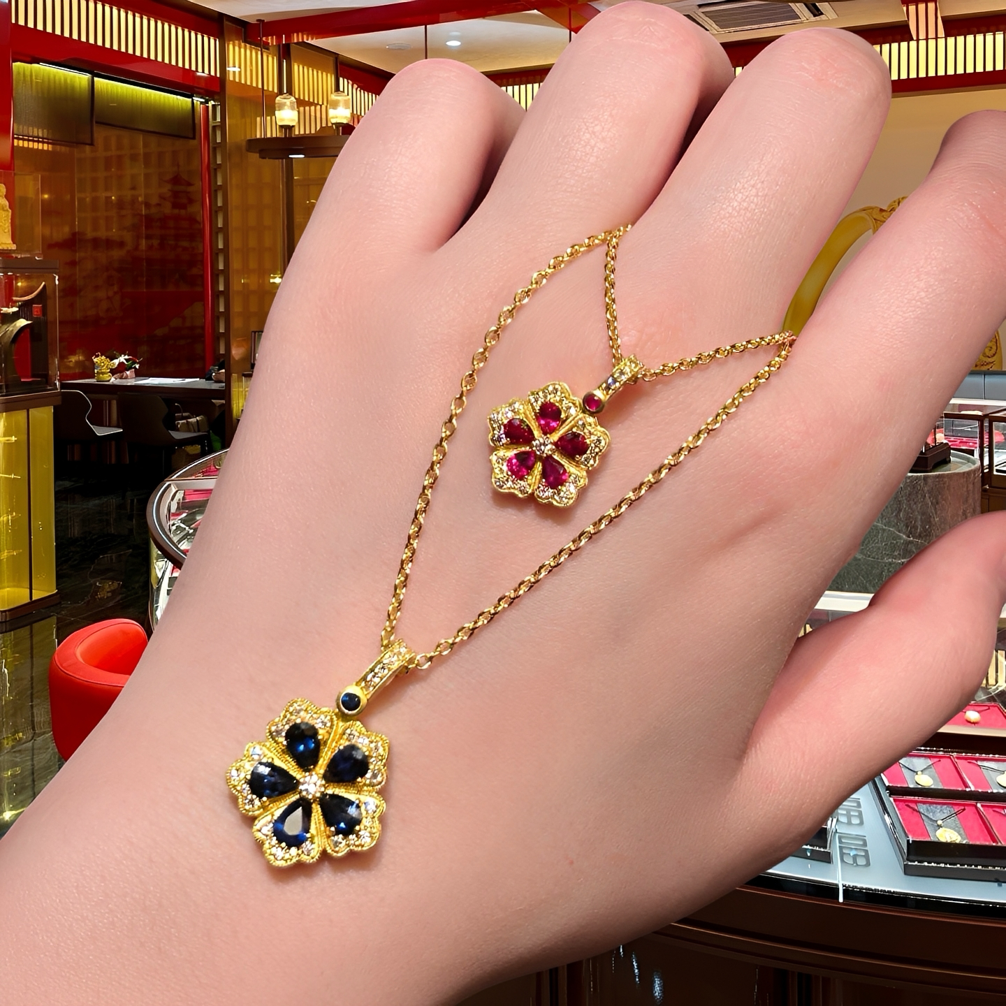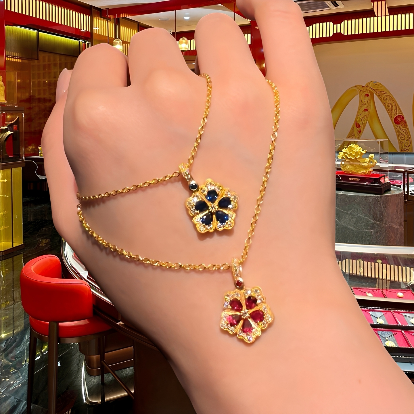 📚 足金包银红蓝宝石牡丹花蕾五花瓣项链女款手工镶嵌君家款式送礼物