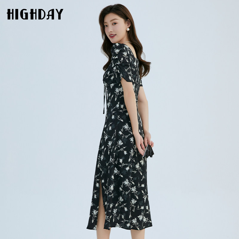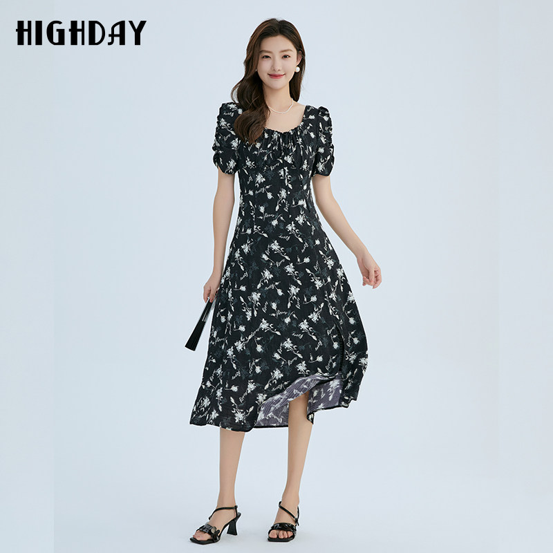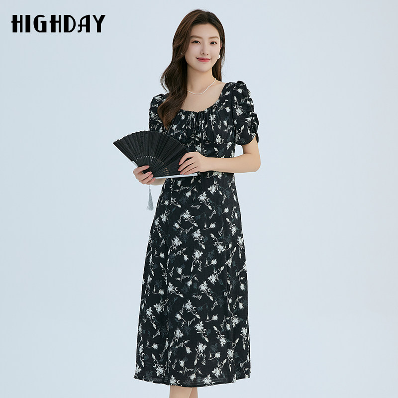 📚 highday轩日24夏装新款大领口法式印花裙女商场款抽褶修身连衣裙