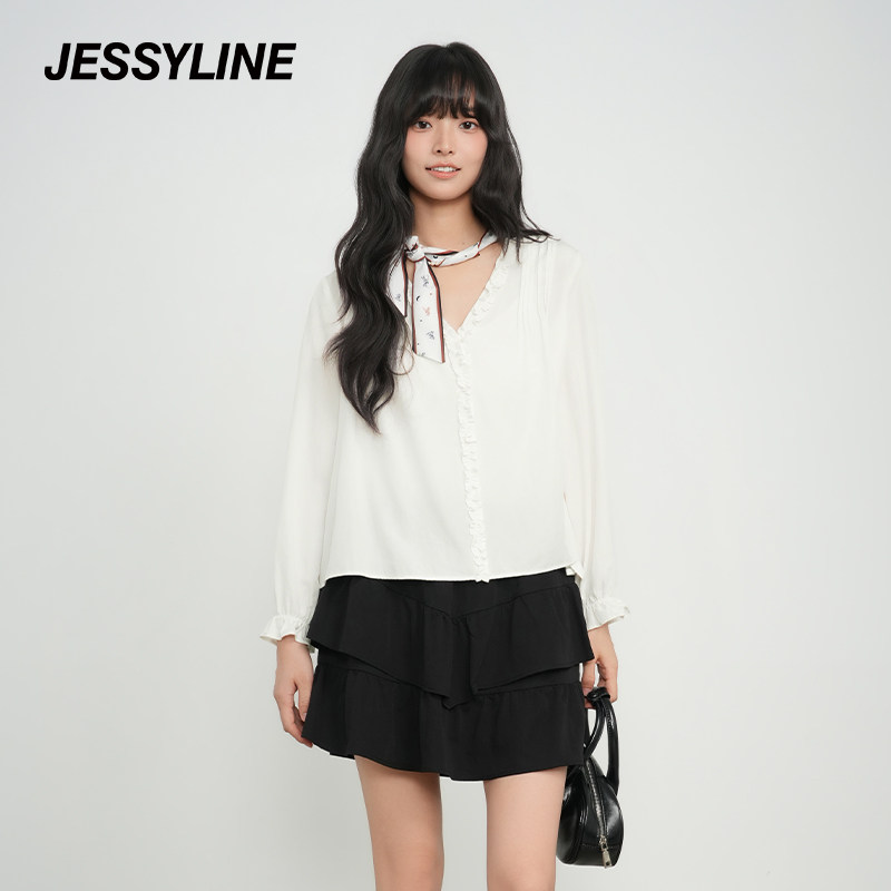 📚 jessyline杰茜莱2025秋白色花边V领长袖衬衫女法式小个子上衣