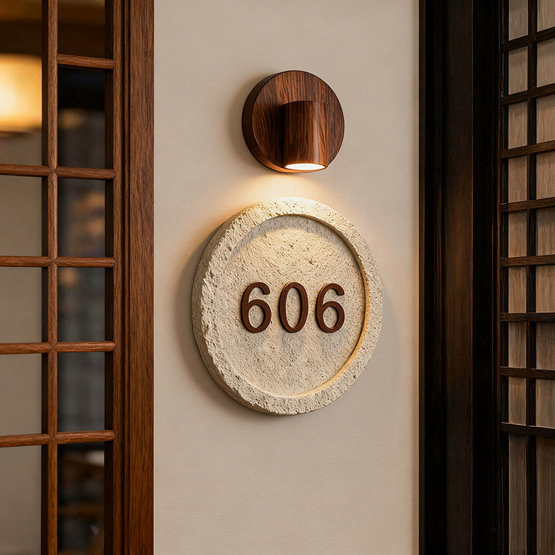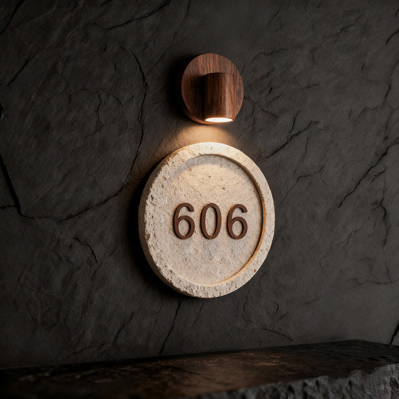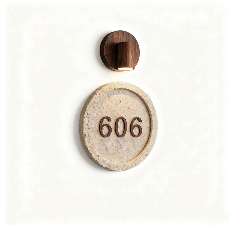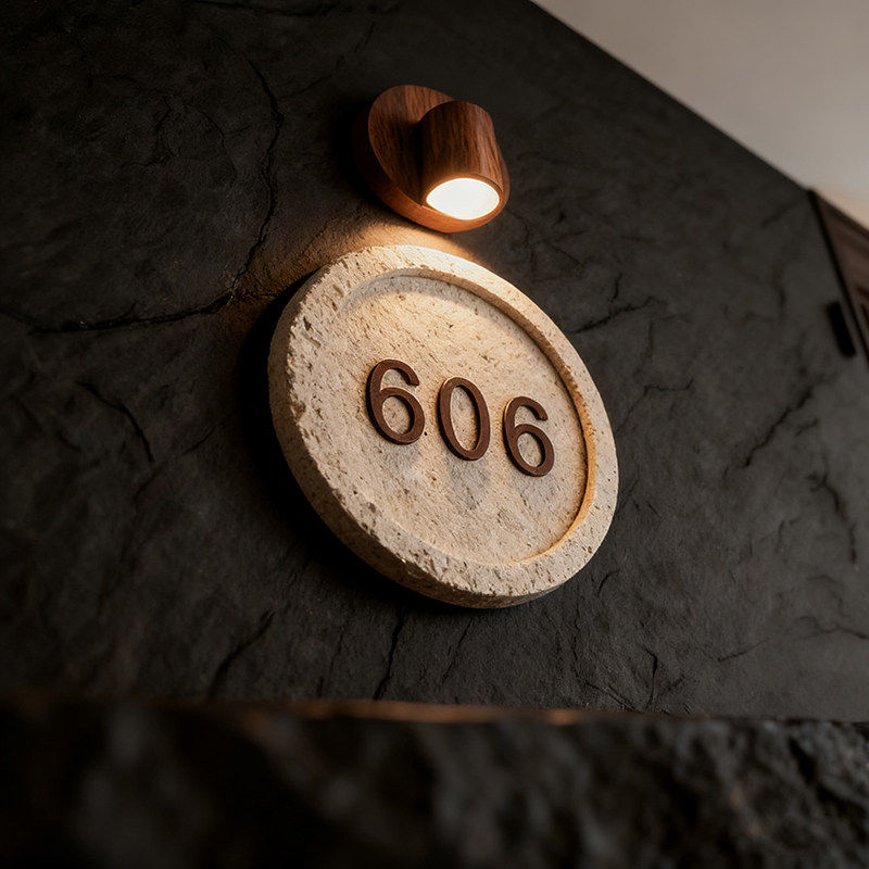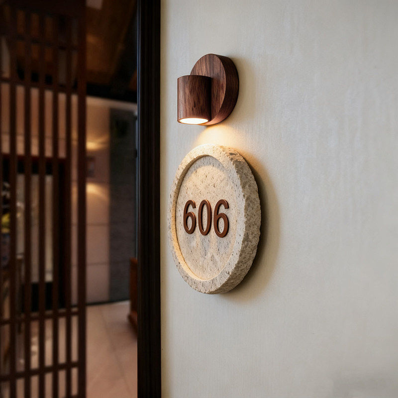 📚 轻奢饭厅包厢指引牌定制胡桃木洞石门牌酒店客房包间发光门牌号