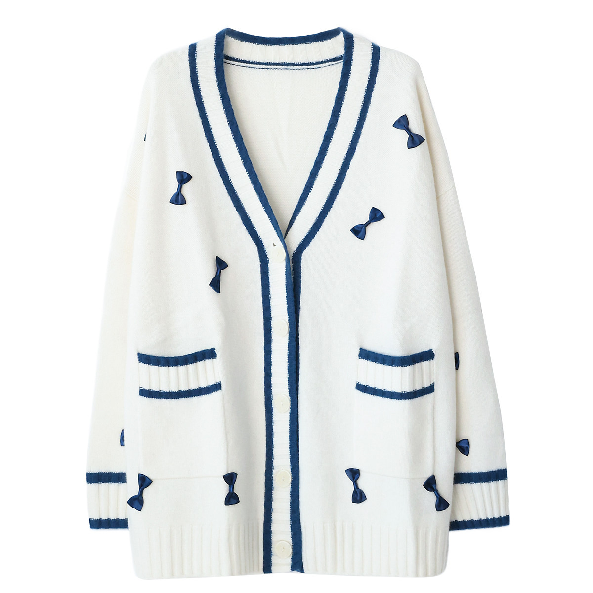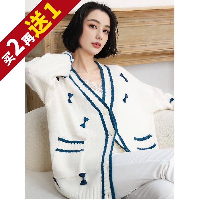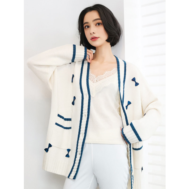📚 KAKA巴黎秀款重磅山羊绒V领单排扣蝴蝶结法式浪漫宽松开衫毛衣特