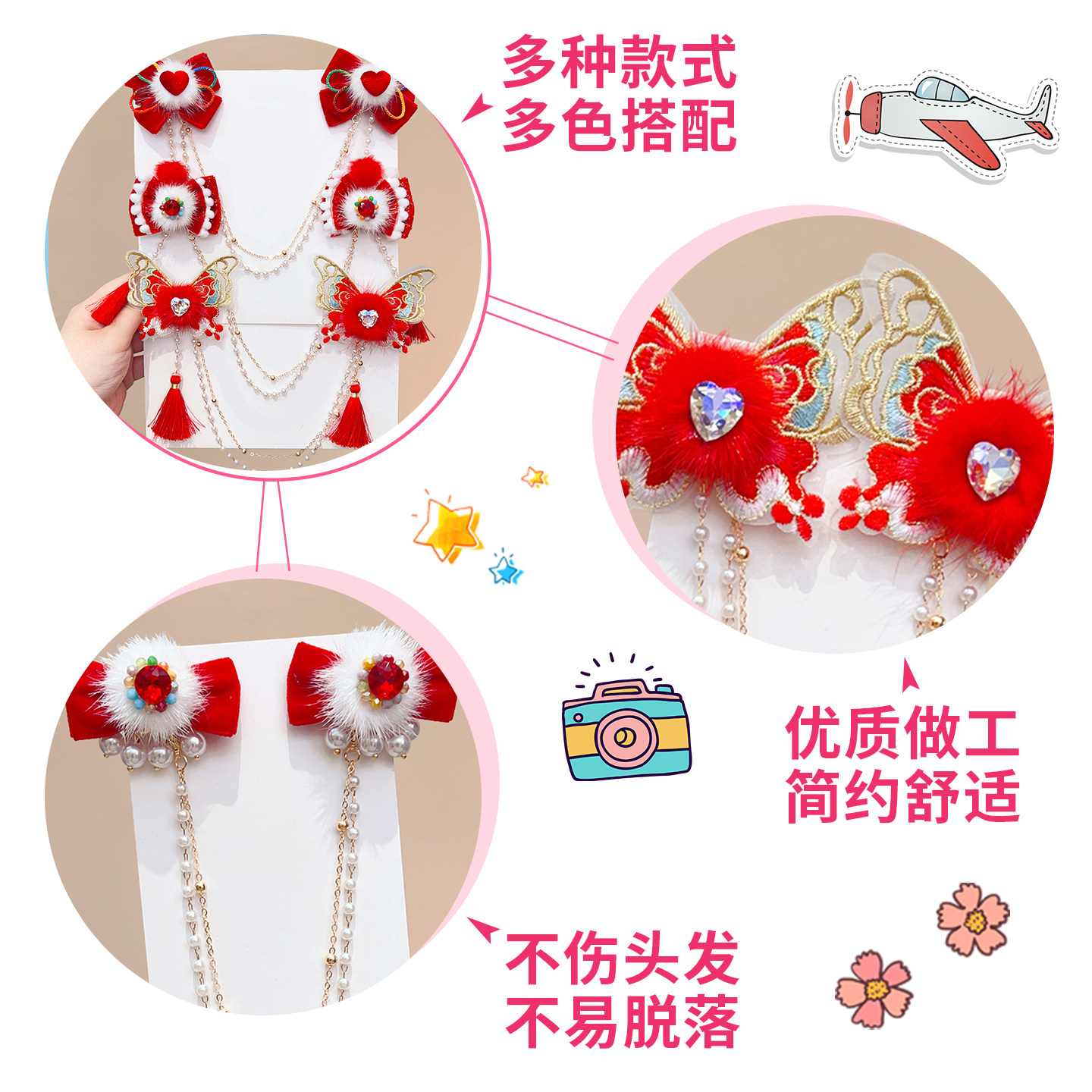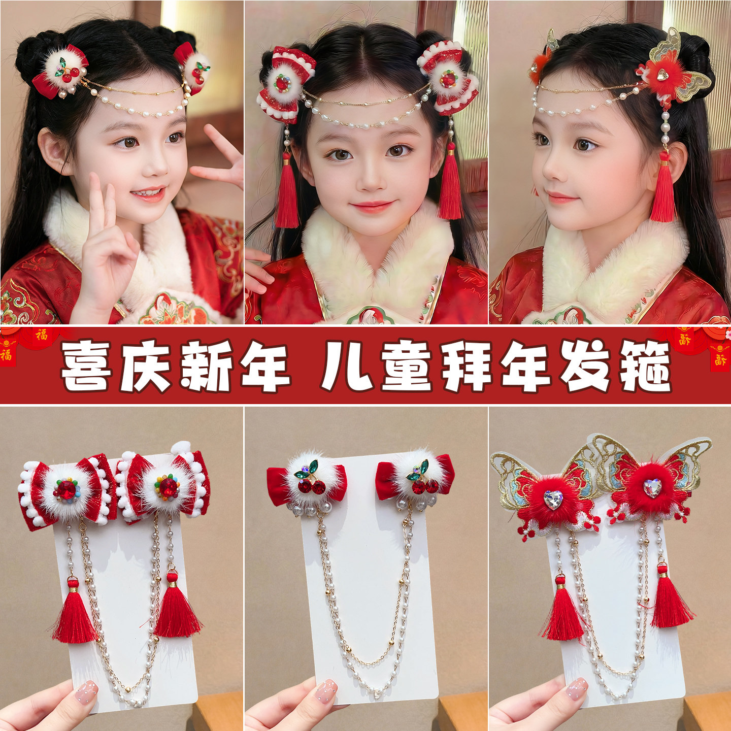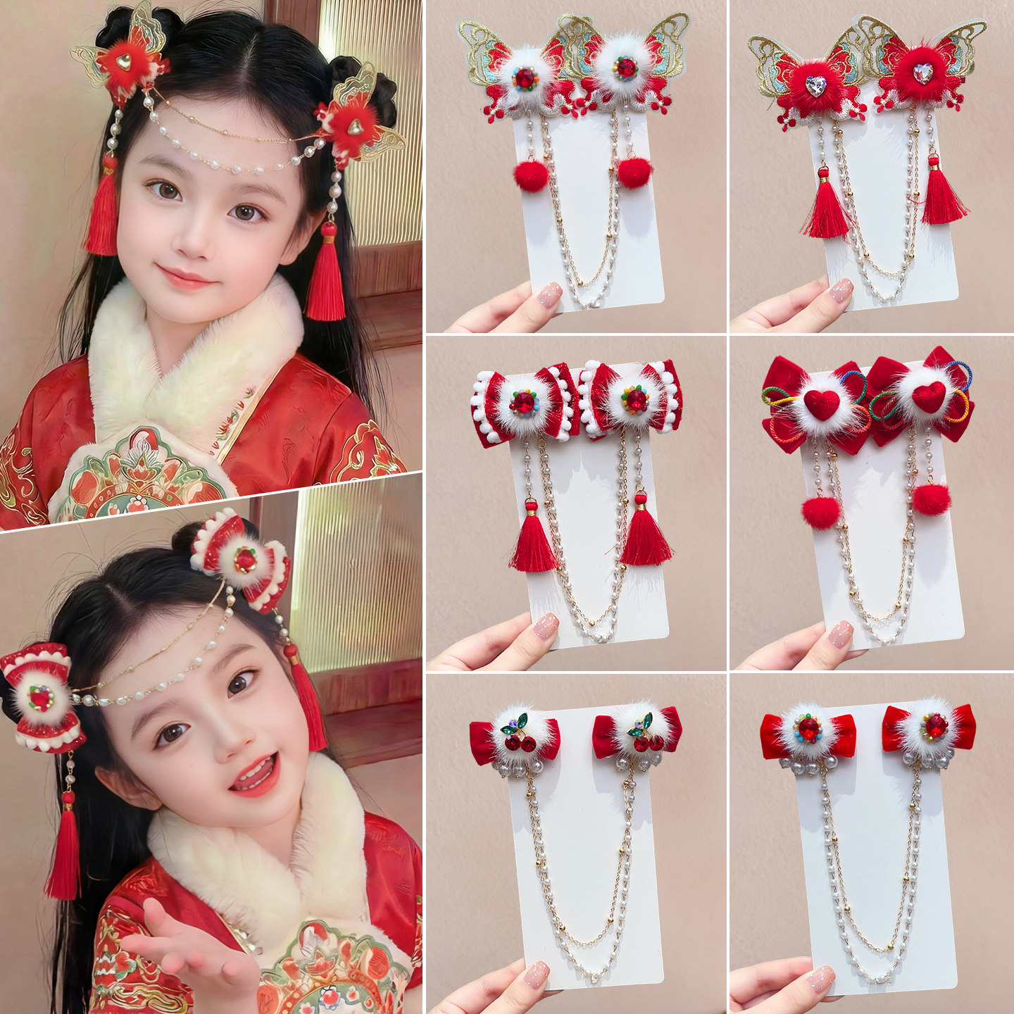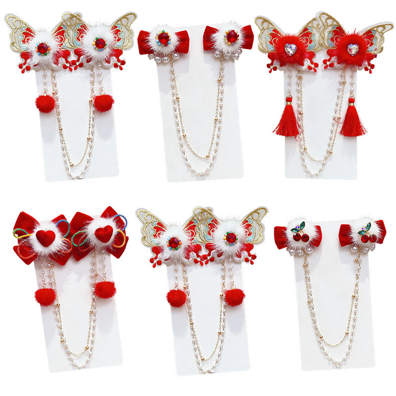 📚 新年儿童额头链蝴蝶毛球对夹子前额女童公主古风汉服头饰过年发饰